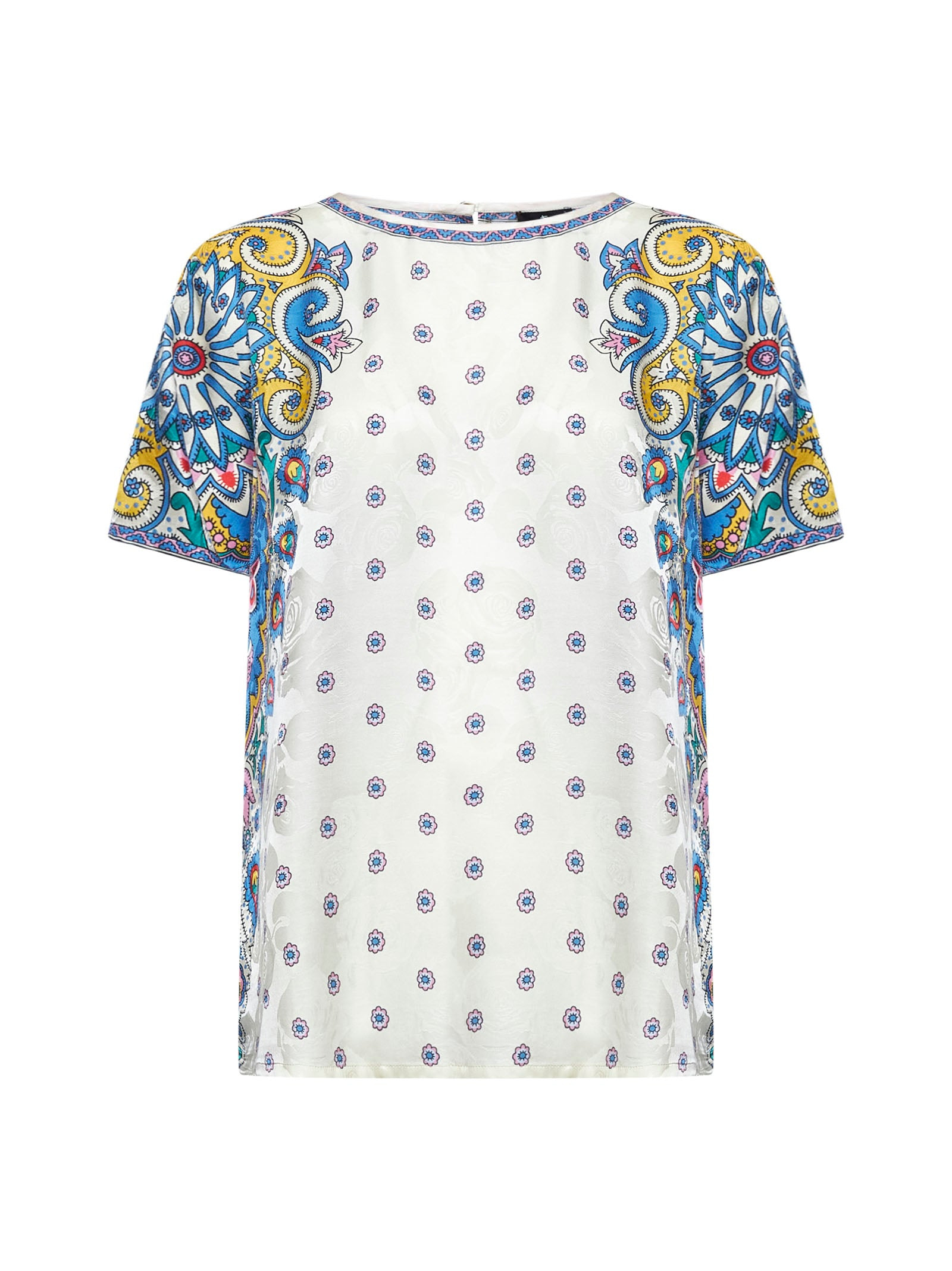 •Teardrop opening with button at neck back •Crewneck •Short sleeves •Placed floral Paisley print; all-over tone-on-tone jacquard rose motif •Regular fit •Ivory color •65% Viscose, 35% Silk •Made in Italy Size and fit: Model is 173 cm tall and wears size IT 40 Country of manifacture: Italy ID designer: WRJA0025AQ115X0800