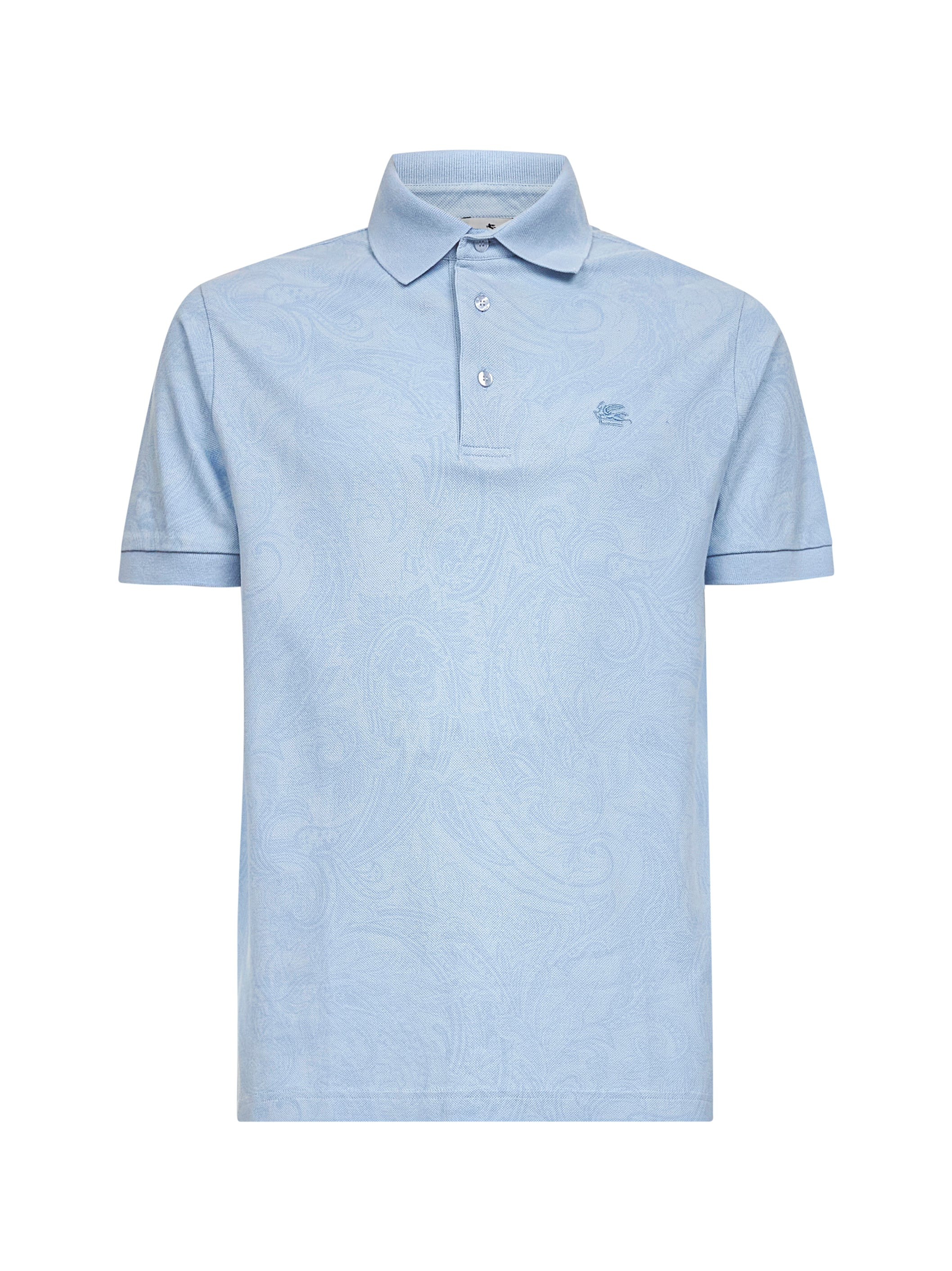 - Front three-button placket - Ribbed polo collar - Short sleeves, ribbed cuffs - Tone-on-tone etro monogram and pegaso embroidered at chest - Side slits at bottom - All-over tone-on-tone paisley jacquard motif - Regular roma fit - Light blue color - 100% cotton - Made in italy Natural (Veg): Cotton100 % Made in: Season: P25 MRMD0004AJ234X0881