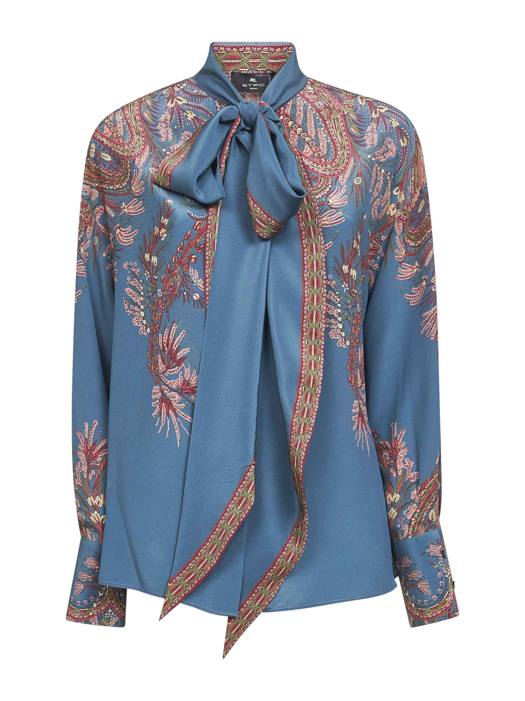 - Front covered button placket - Adjustable lavalliere collar - Long sleeves, dropped shoulders, high two-button cuffs - Straight hem - Multicolor placed floral paisley print - Regular fit - Light blue color - 100% silk - Made in italy Natural (other): Silk100 % Made in: Italy Season: A25 WRIA007799SP1G7X0883