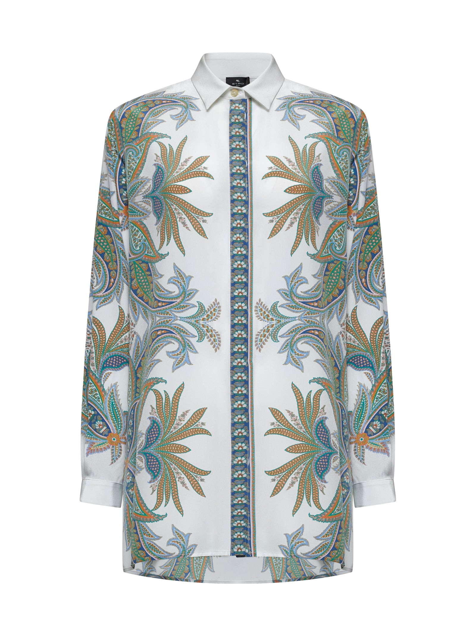 •Front covered button placket •Classic collar •Long sleeves, buttoned cuffs •Side slits at bottom •Dropped back hem •Placed floral Paisley print •Straight cut •Regular fit •White color •100% Silk •Made in Italy Size and fit: Model is 173 cm tall and wears size IT 40 Country of manifacture: Italy ID designer: WRIA0029AK793X0830