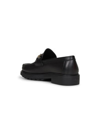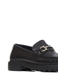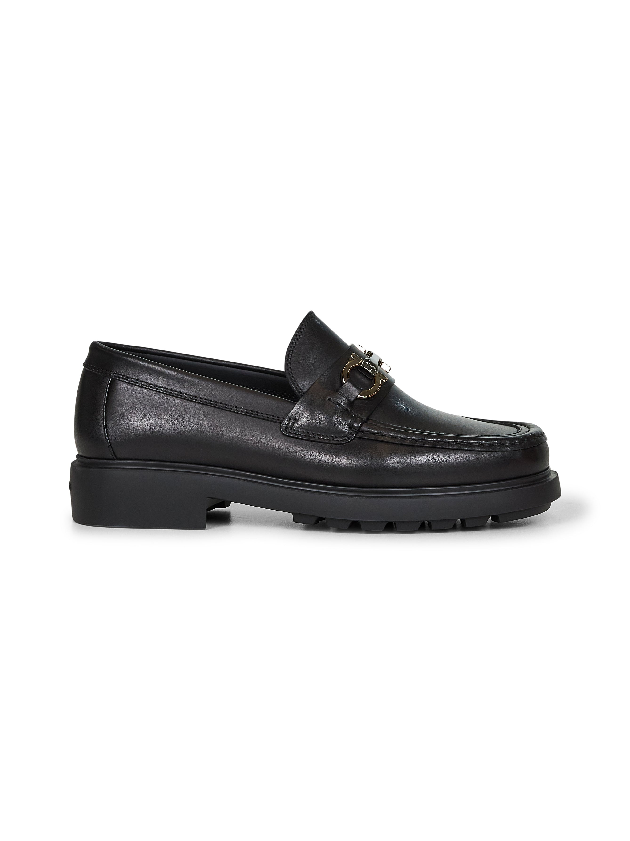 Ferragamo’s black leather loafers featuring a rounded toe, Gancini buckle on the front strap, leather lining and insole and chunky tread rubber sole. Color: Black Composition: 100% calfskin Country of manifacture: Italy ID designer: 022300DUGLAS768108