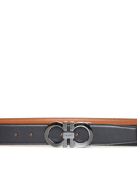 Salvatore Ferragamo's Gancini reversible leather belt featuring a black side, a tan side and silver-tone metal logo buckle. Color: Black - tan Size and fit: Width: 35 mm Composition: 100% calfskin Country of manifacture: Italy ID designer: 670084DOUBLEADJUS750184