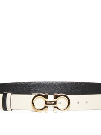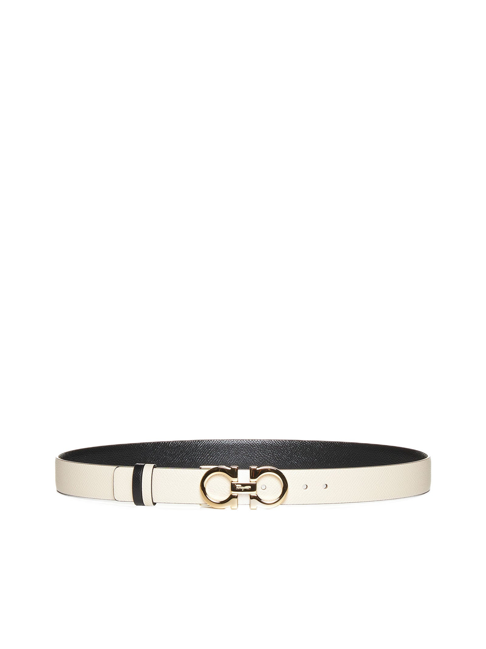 Salvatore Ferragamo’s reversible belt in bone white and black leather with Gancini gold-tone metal logo buckle. Color: Bone - black Size and fit: Width: 25 mm Composition: 100% calfskin Country of manifacture: Italy ID designer: 23A565DONNAH25741534