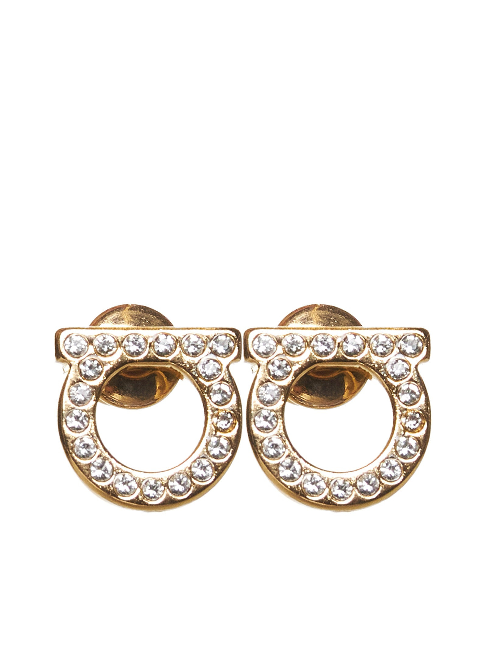 Salvatore Ferragamo’s Gancini gold-tone metal earrings with rhinestones embellishment, lettering logo and Made in Italy embossed on the back. Color: Gold Size and fit: Diameter: 8 mm Composition: 90% brass 10% glass Country of manifacture: Italy ID designer: 760123STUDSTRA8D696576