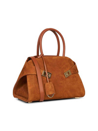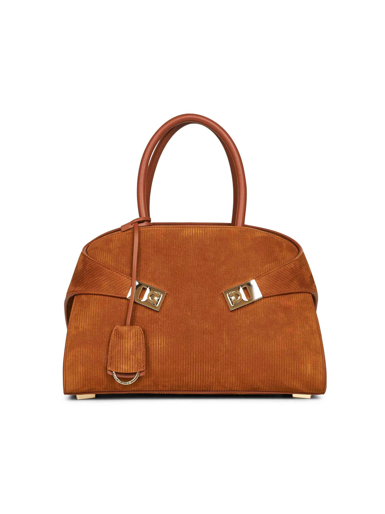 - Inner leather tab with metal bar fastening; gussets with metal gancini buckles at front - Double top smooth leather handle; adjustable and detachable smooth leather shoulder strap - Interior: one main compartment, one zip pocket; leather lining - Detachable all-over ripple corduroy-effect calfskin suede key ring charm - Metal feet - Gold-toned metal hardware - All-over ripple corduroy-effect calfskin suede design with asymmetric back - 31.5 x 22 x 19 cm; handle drop: 14 cm, shoulder strap drop: 55 cm - Tan color - 100% calf leather - Made in italy Furs & Skins: Lamb Skin80 % Furs & Skins: Calf Leather20 % Made in: ITALIA Season: A25 215608HUGTHS785775
