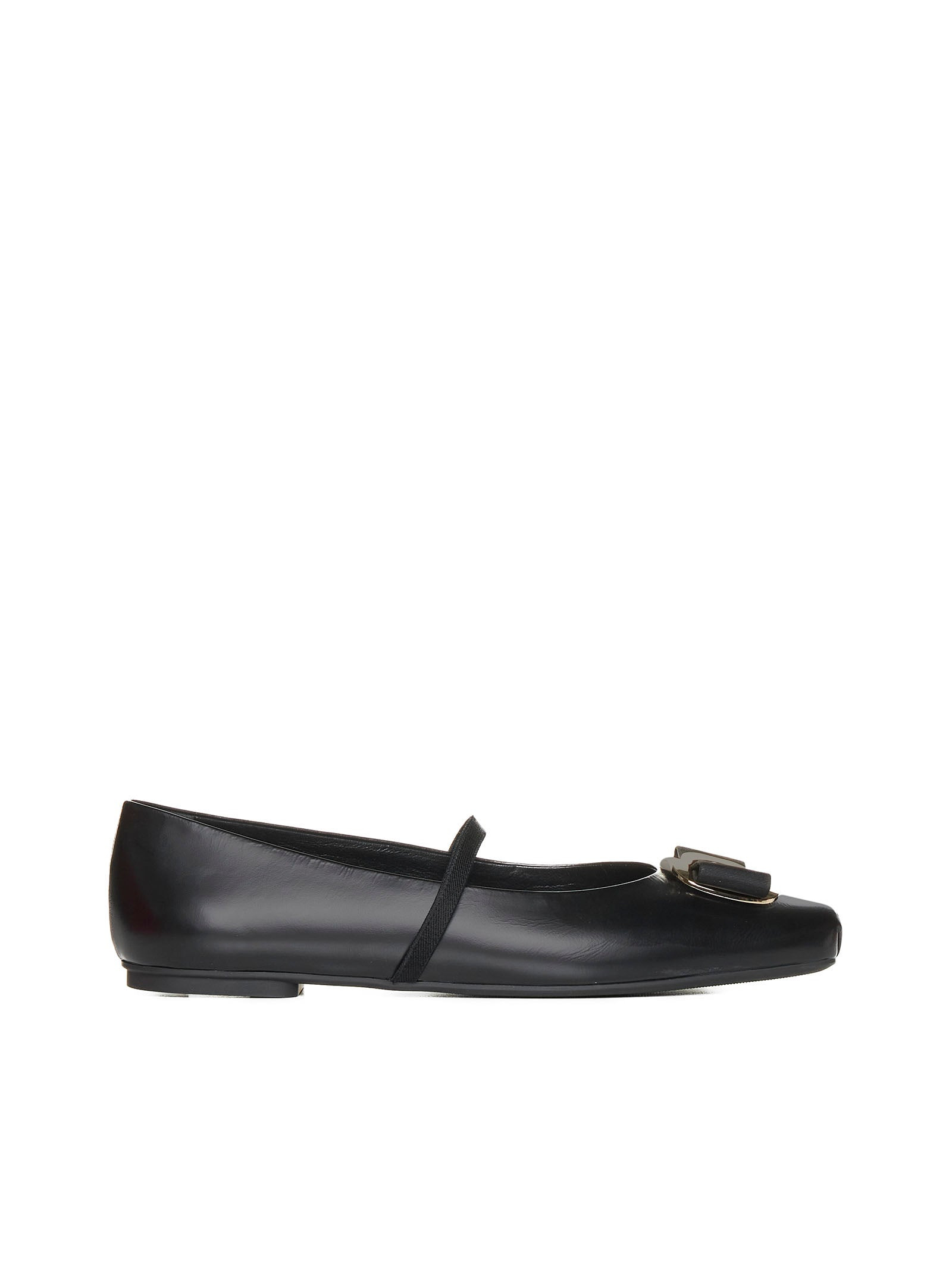 Ferragamo’s Zina black leather ballet flats featuring a square toe, signature Vara bow with gold-tone metal logo buckle, elasticated strap, flat leather sole and low heel. Color: Black Composition: 100% lambskin Country of manifacture: Italy ID designer: 01H345ZINA768868