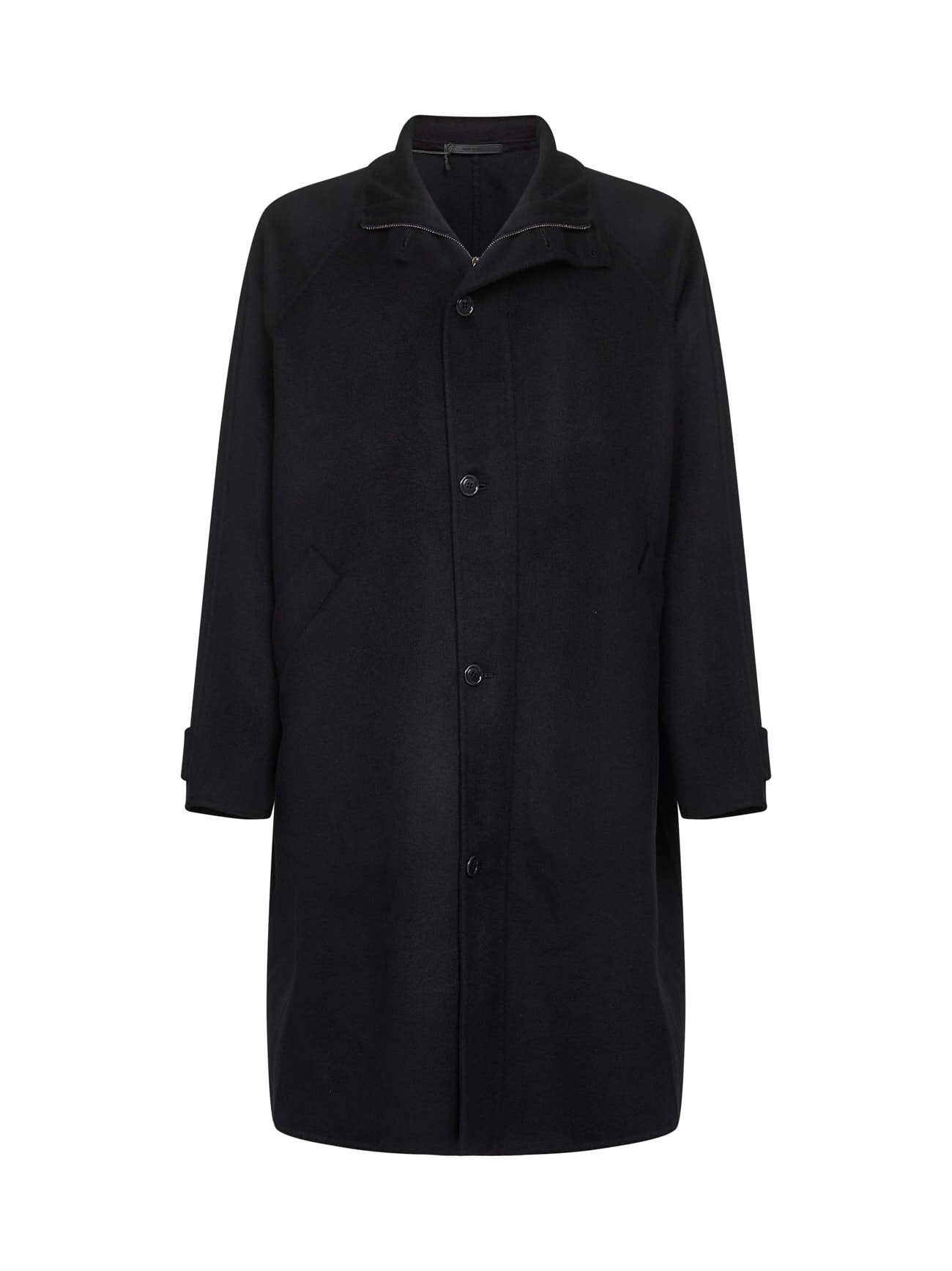 - Covered zip and button placket - Standing buttoned collar - Long sleeves, raglan shoulders, buttoned straps detail at sleeves bottom - Slanted side pockets - Length: 110 cm - Loose fit - Blue color - 97% cashmere, 3% polyester - Made in italy Wool or fine animal hair: Cashmere97 % Synthetic: Polyester3 % Made in: ITALIA Season: A25 GM002277TE10068UB109