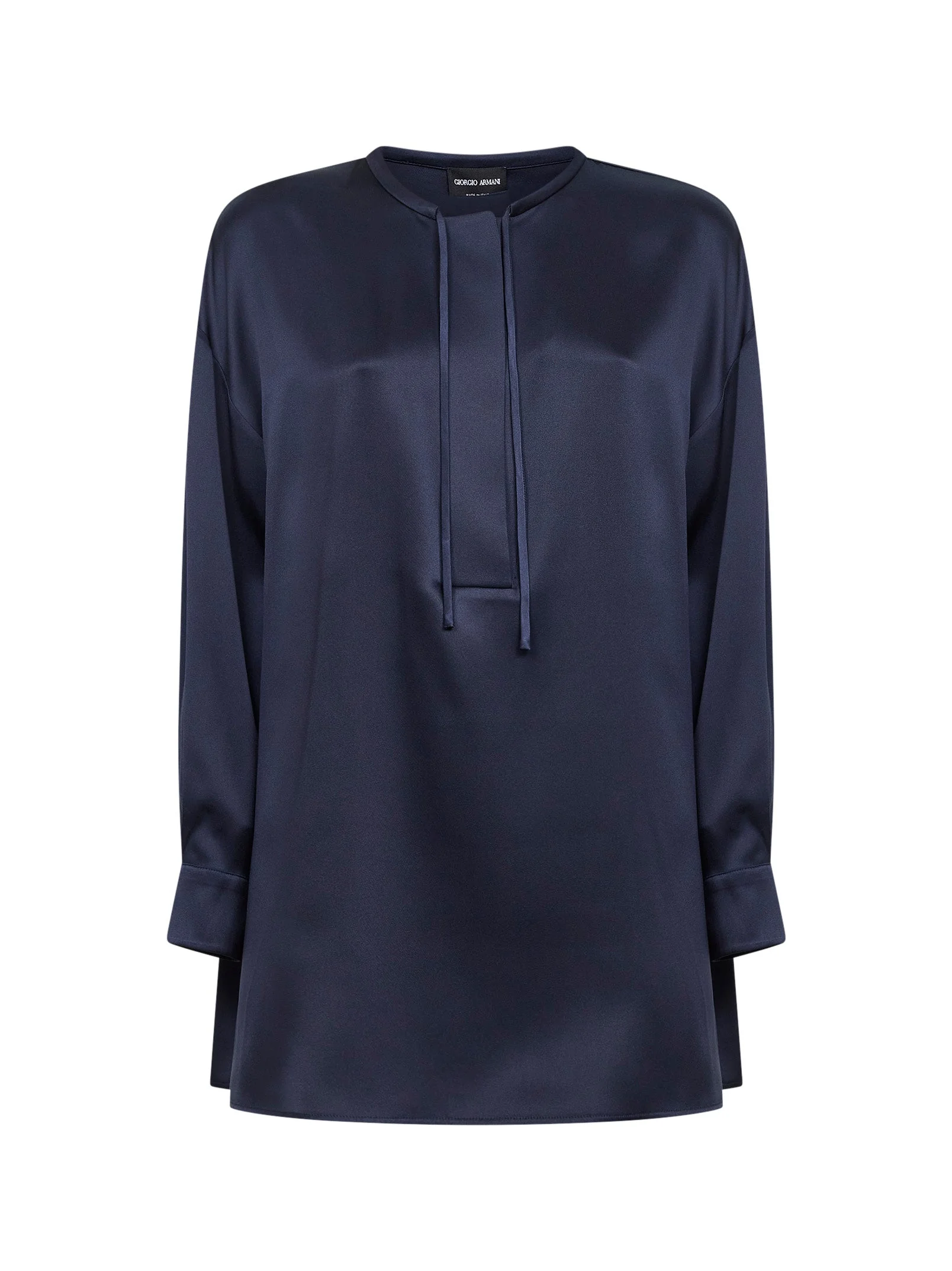 - Front partial covered button placket - Crewneck with adjustable ties - Long sleeves, dropped shoulders, buttoned cuffs - Side slits at bottom - Rounded hem - Lined - Relaxed fit - Blue color - 100% silk - Made in italy Natural (other): Silk100 % Made in: ITALIA Season: P26 GW002564TE10101UB110