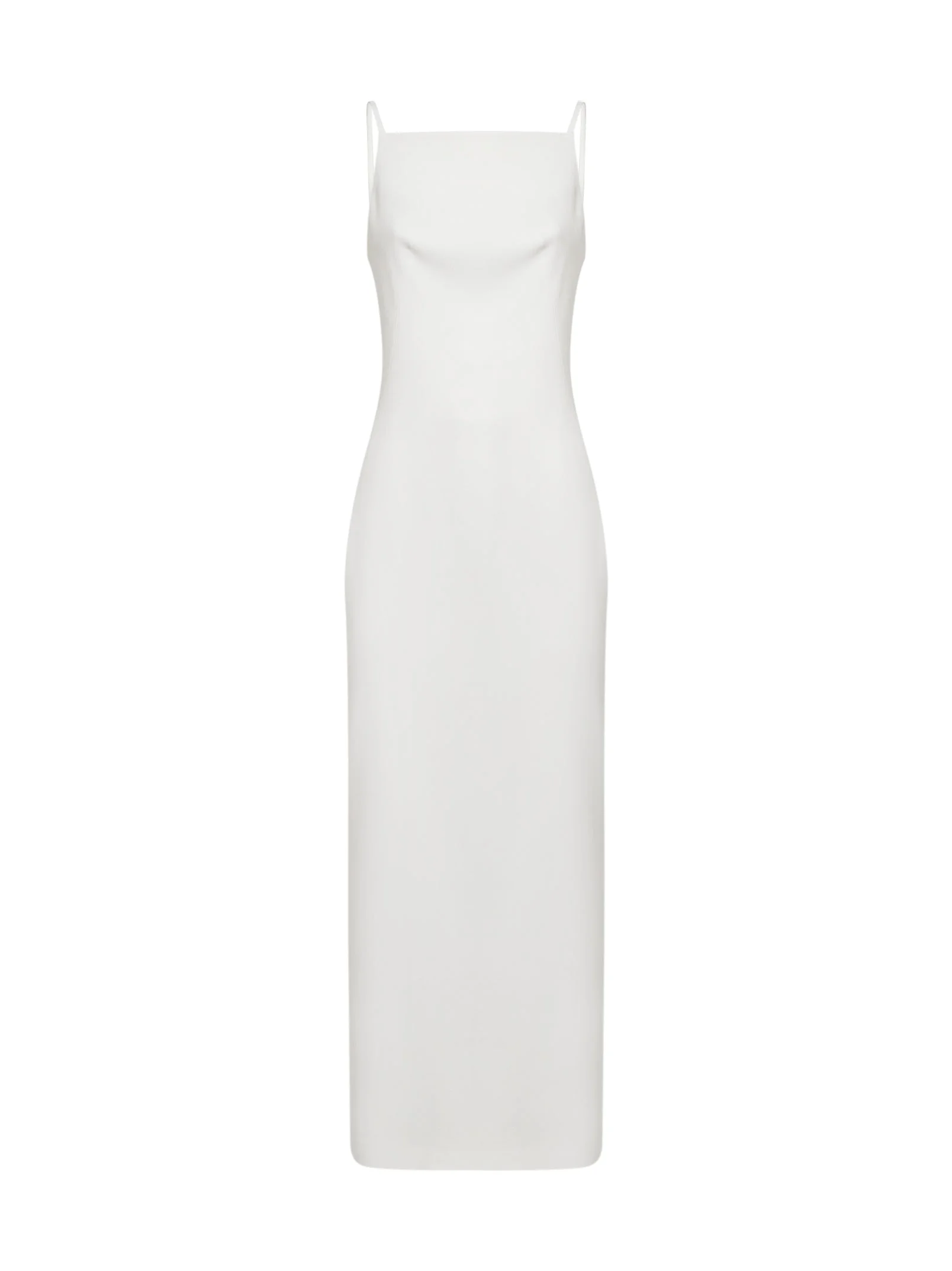 - Back invisible zip closure - High square neckline with thin shoulder straps; square neckline at back - Center slit at back - Lined - Ankle length - Ivory color - 65% viscose, 32% acetate, 3% elastane - Made in italy Synthetic: viscose65 % Synthetic: Acetate32 % Synthetic: Elastane3 % Made in: Italy Season: P26 BW22SZ164K105