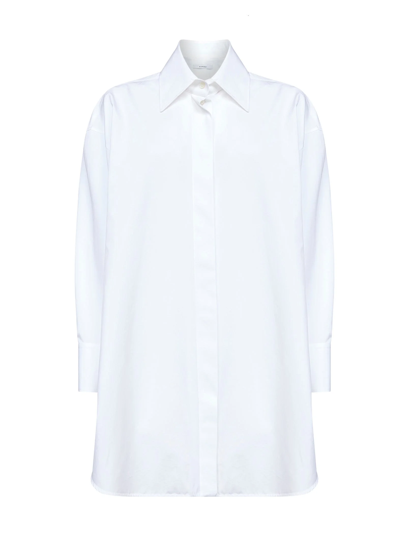- Front covered button placket - Classic collar - Long sleeves, dropped shoulders, buttoned cuffs - Asymmetric hemline, shorter at the back - The model can be tied at front - White color - 100% cotton - Made in italy Natural (Veg): Cotton100 % Made in: Italy Season: P26 BW61JF1634100