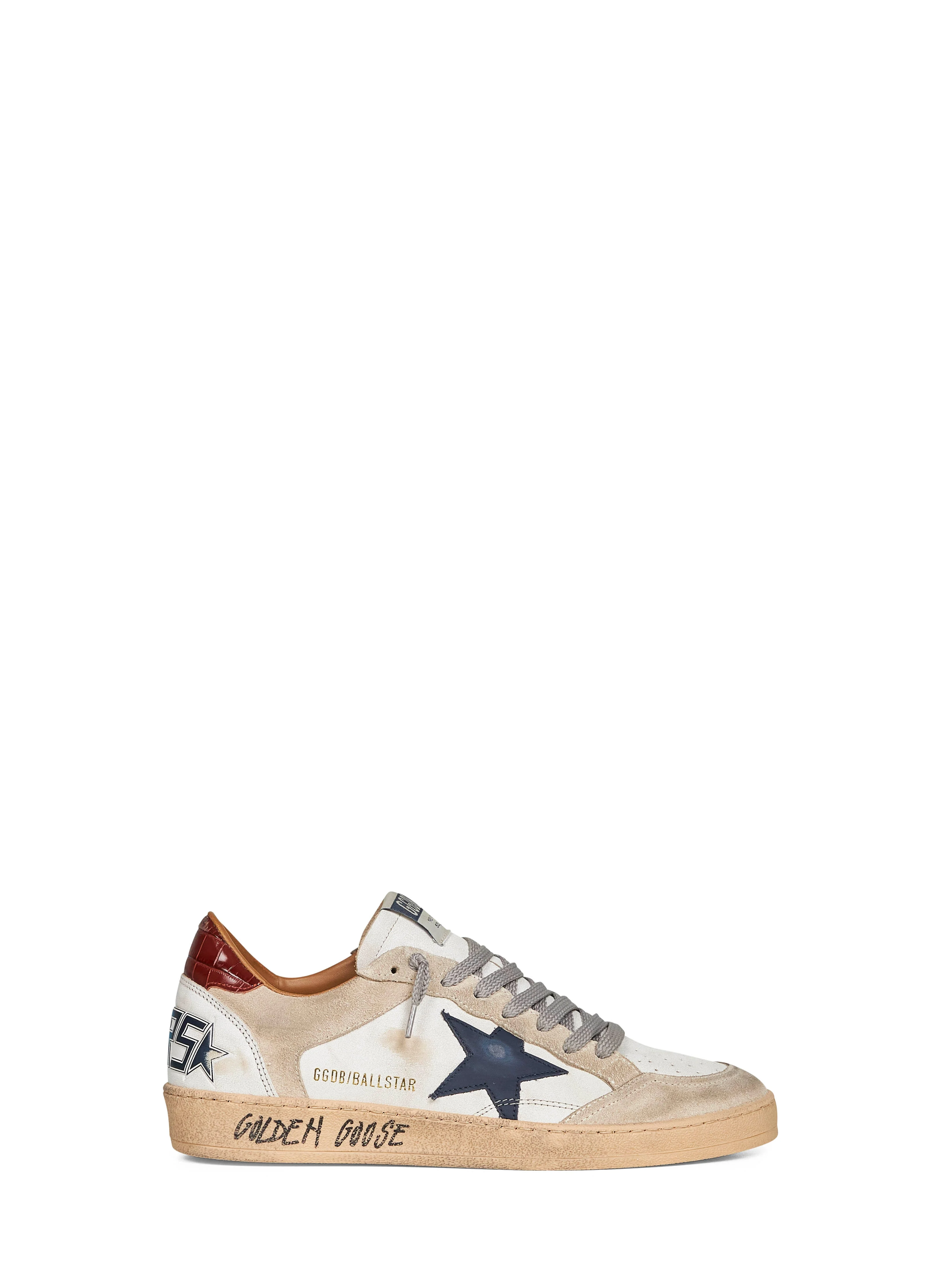 - Front lace-up fastening - Perforated round suede toe - Suede tongue with logo label - Brown crocodile-print leather heel counter; ink blue "sneakers" lettering at heels - White leather and beige suede upper; ink blue suede star and gold ggdb lettering at side - Rubber sole; contrasting "golden goose" lettering at foxing - Vintage treatment - The shoe corresponds to a it 43 size - Color: white/beige - 93% goatskin, 7% cal leather - Made in italy Furs & Skins: Goat Skin93 % Furs & Skins: Calf Leather7 % Made in: ITALIA Season: P26 GMF01034F00812712387
