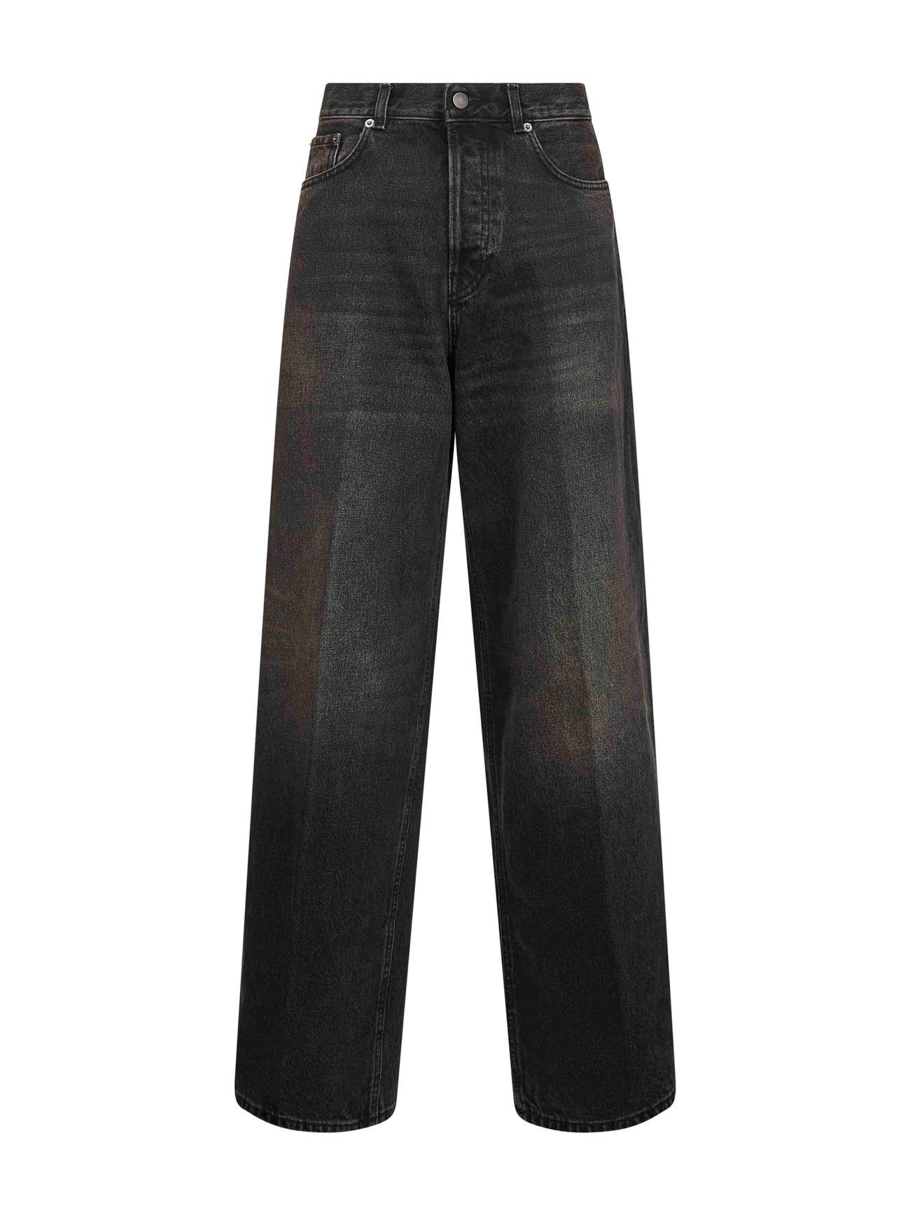 - Covered front closure, metal logo button - Low-rise waist with belt loops - Five-pocket model - Logo patch at back waistband - Wide leg - Earl wash with light whiskering - Loose and relaxed fit - Black color - 100% cotton - Made in italy Natural (Veg): Cotton100 % Made in: Italy Season: A25 HEW03296DF119L0893