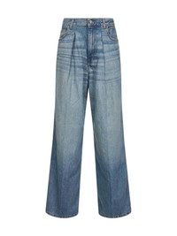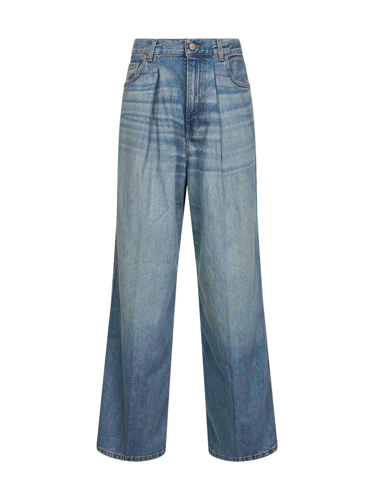- Covered front closure, metal logo button - Low-rise waist with belt loops - Five-pocket model - Logo patch at back waistband - Sculpted pleats detail at front - Wide leg - Ionic blue wash with whiskering - Light blue color - 82% cotton, 18% lyocell - Made in italy Natural (Veg): Cotton82 % Synthetic: Lyocell18 % Made in: Italy Season: A25 HEW03340DF144L0876
