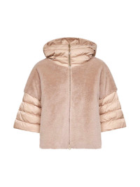 - Front full-zip double-slider zip closure - Hood; metal herno logo plate at back - Three-quarter layered-effect sleeves - Side welt pockets - Lined; down padding - High-density striped-quilted satin and beaver-effect faux fur design - Regular fit - Beige color - 100% polyester - Made in romania Synthetic: Polyester100 % Made in: Romania Season: A25 PI002132D12170Z1985