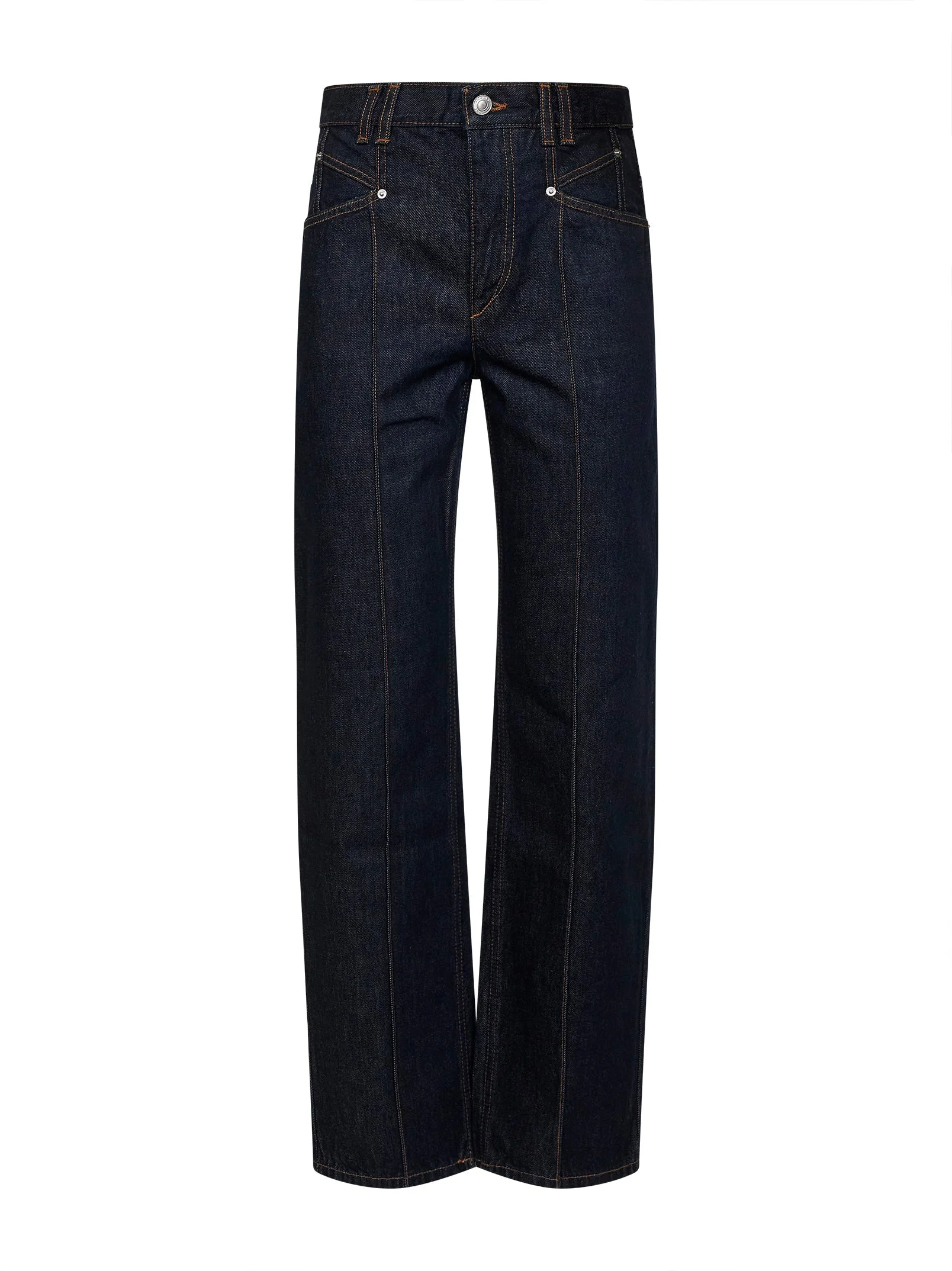 - Front zip-fly closure, metal logo button - Regular waist with belt loops - Front pockets, back patch pockets - "isabel marant"-embossed leather patch at back waistband - Back yoke - Stitched legs creases at front - Contrasting topstitching - Relaxed straight leg - Dark midnight blue color - 100% cotton - Made in extra eu Natural (Veg): Cotton100 % Made in: Tunisia Season: P26 PA0686FAD1H02I30DM
