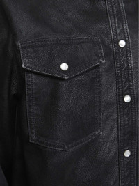 - Front snap button placket - Shirt collar - Long sleeves, snap-buttoned cuffs - Patch pockets at chest with snap-buttoned flap - Back yoke with box pleats - Rounded hem - Vintage-effect finish faux leather design - Straight fit - Black color - 63% polyurethane, 28% viscose, 9% other fibers - Made in extra eu Synthetic: Polyurethane63 % Synthetic: viscose28 % Synthetic: other fibers9 % Made in: Tunisia Season: A25 CH0240FAC3B01E01BK