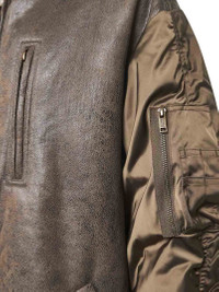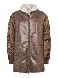 - Front double-slider zip closure - Shearling-effect bomber collar - Long gathered satin nylon sleeves, dropped shoulders, ribbed knit cuffs - Diagonal side snap-buttoned welt pockets, zipped chest welt pocket, zipped pocket with additional compartments at left sleeve - Shearling-effect fabric lining - Vintage-effect finish faux leather design - Midi length - Straight fit - Brown color - 100% polyester - Made in extra eu Synthetic: Polyester100 % Made in: China Season: A25 MA0426FBC3C01E67KI