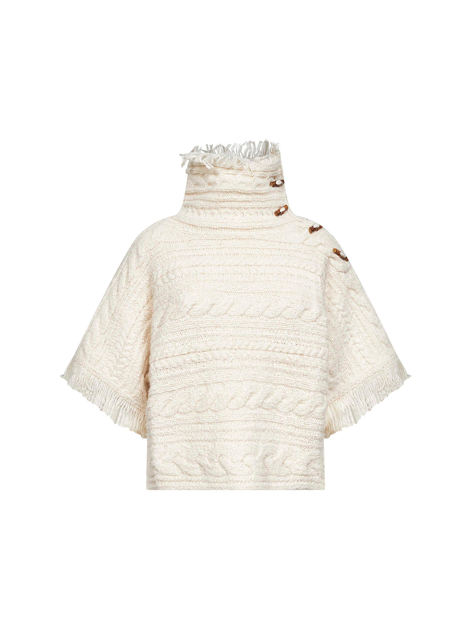 - Bamboo button closure at left shoulder - Asymmetric high collar (can also be worn open) - Short kimono sleeves - Fringed finishes at collar and sleeves - Mixed cable and twisted knit design - Casual fit - Ecru color - 55% cotton, 32% other fibers, 13% alpaca - Made in extra eu Natural (Veg): Cotton55 % Wool or fine animal hair: Alpaca13 % Synthetic: other fibers32 % Made in: China Season: A25 PU0729FAC3L02E23EC