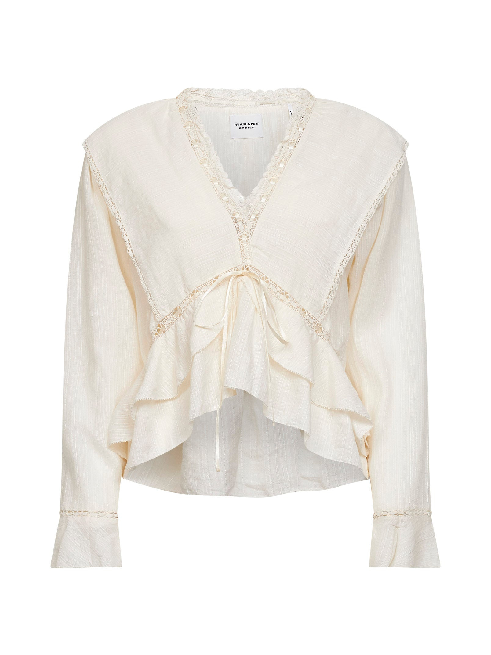 - V-neckline - Long sleeves, bell cuffs - Asymmetric underbust seam detail with self-tie ribbon - Double asymmetric ruffle detail at bottom; asymmetric hemline, shorter at front - Tone-on-tone sheer lace inserts at neckline, cuffs and bust - Fluid fit - Ecru color - 60% cotton, 36% linen, 4% viscose - Made in extra eu Natural (Veg): Cotton60 % Natural (Veg): Linen/Flax36 % Synthetic: viscose4 % Made in: India Season: P26 HT0783FAD1J11E23EC