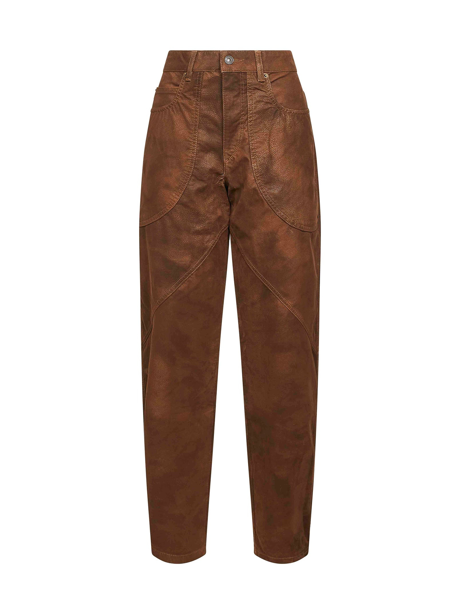 - Front zip-fly closure, metal logo button - Mid-rise waist with belt loops - Five-pocket model - "isabel marant"-embossed leather logo label at back waistband - Metal rivets; silver-toned metal hardware - Vintage-effect finish faux leather design with seams and topstitching detailing - Tapered leg - Relaxed fit - Tobacco color - 63% polyurethane, 28% viscose, 9% other fibers - Made in extra eu Synthetic: Polyurethane63 % Synthetic: viscose28 % Synthetic: other fibers9 % Made in: Tunisia Season: A25 PA0556FAC3B01E50TO