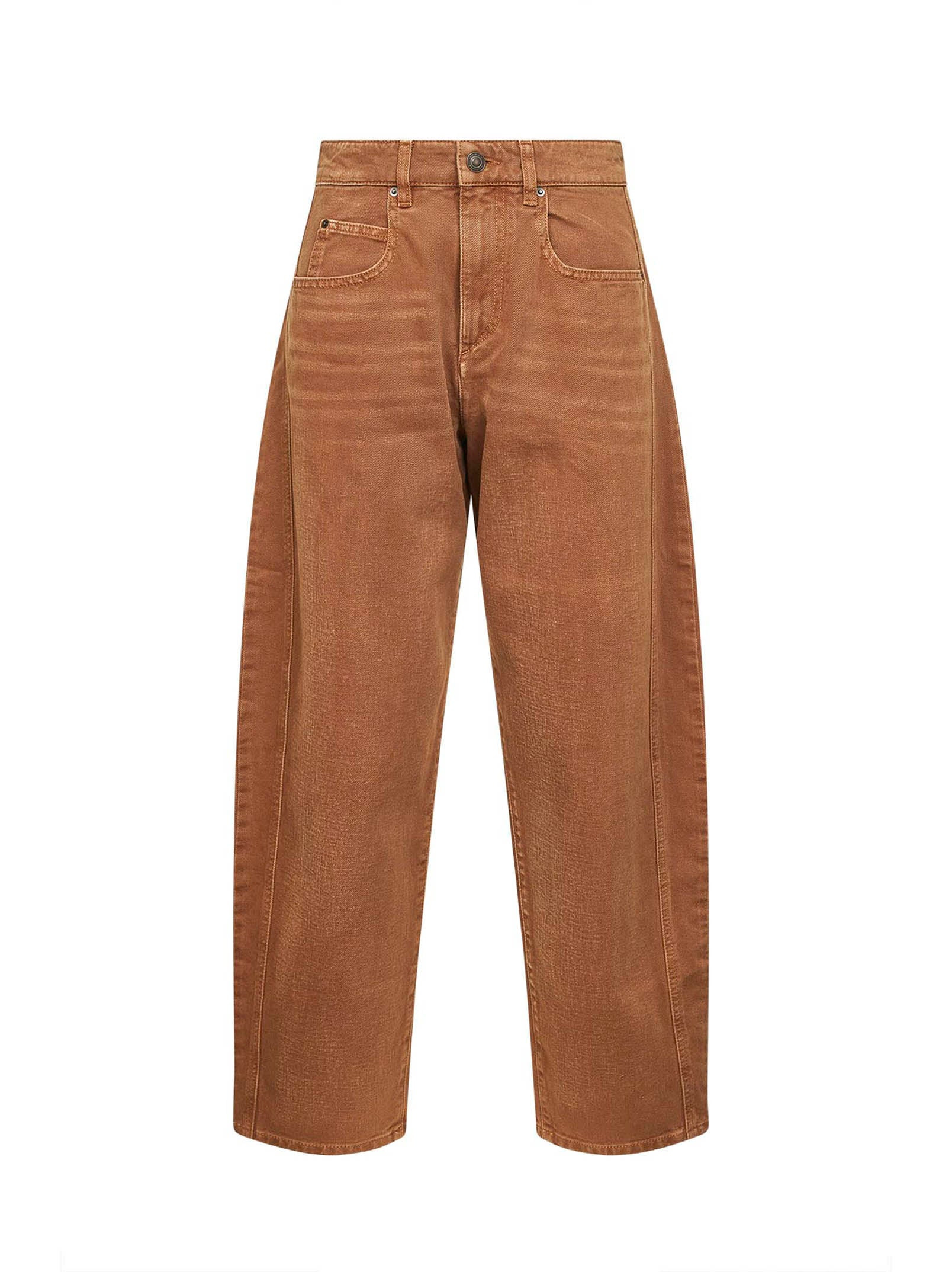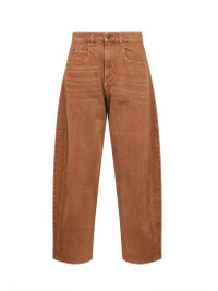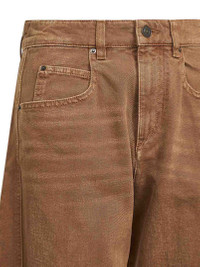 - Front zip-fly closure, metal logo button - Mid-rise waist with belt loops - Five-pocket model - "isabel marant"-embossed leather logo label at back belt - Metal rivets - Rounded leg - Barrel fit - Ochre color - 100% cotton - Made in extra eu Natural (Veg): Cotton100 % Made in: Morocco Season: A25 PA0584FAC3H01I10OE