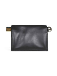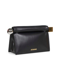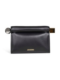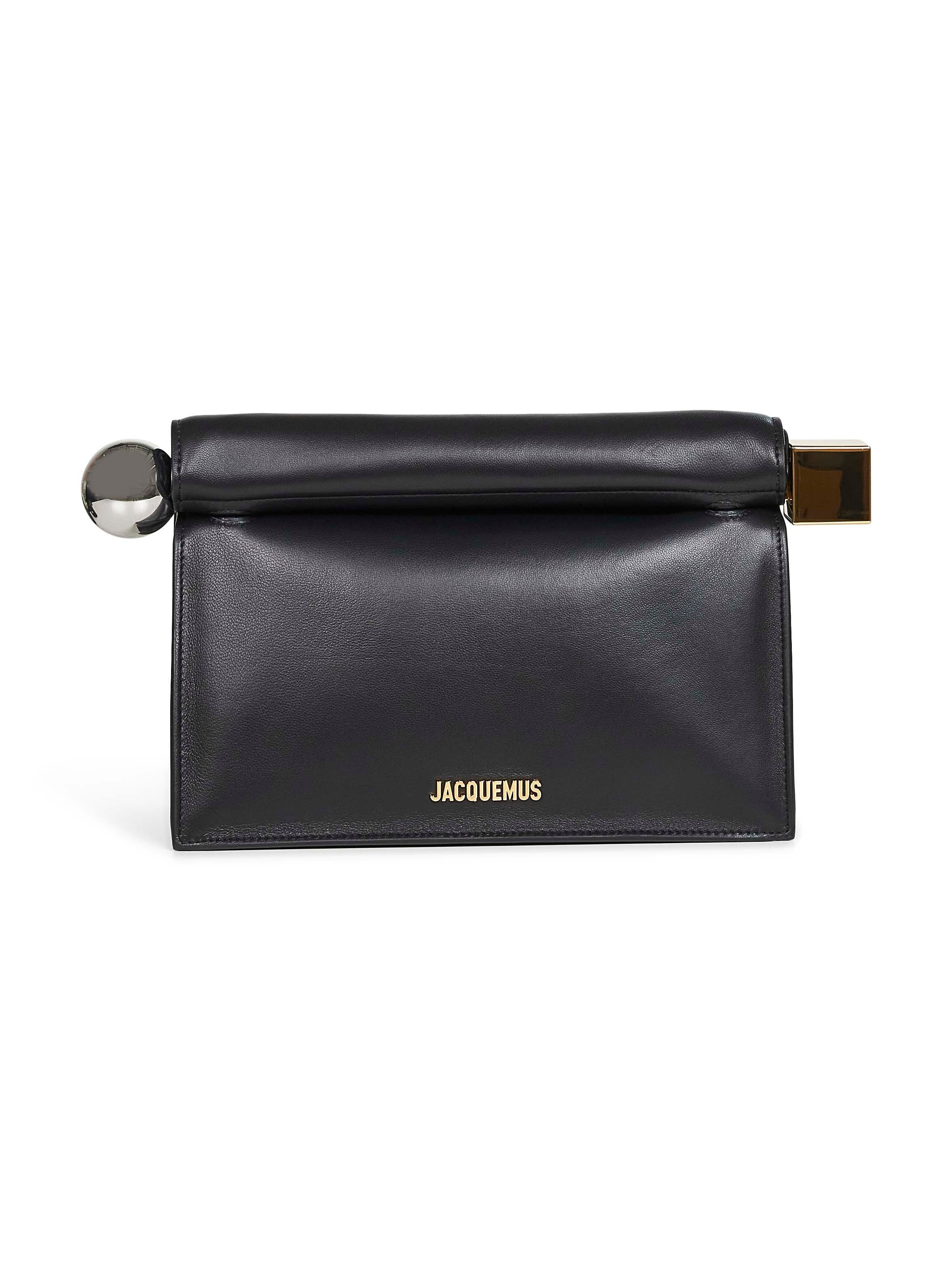 - Magnetic fastening, roll-top; large silver-toned metal circle and gold-toned metal square ends - Gold-toned metal jacquemus logo at front - Interior: one main compartment, one card slot; cotton lining - Nappa leather design - 27.7 x 17 x 12.2 cm - Black color - 100% lambskin - Made in italy Furs & Skins: Lamb Skin100 % Made in: ITALIA Season: A25 BAW00356AC27L14-990
