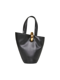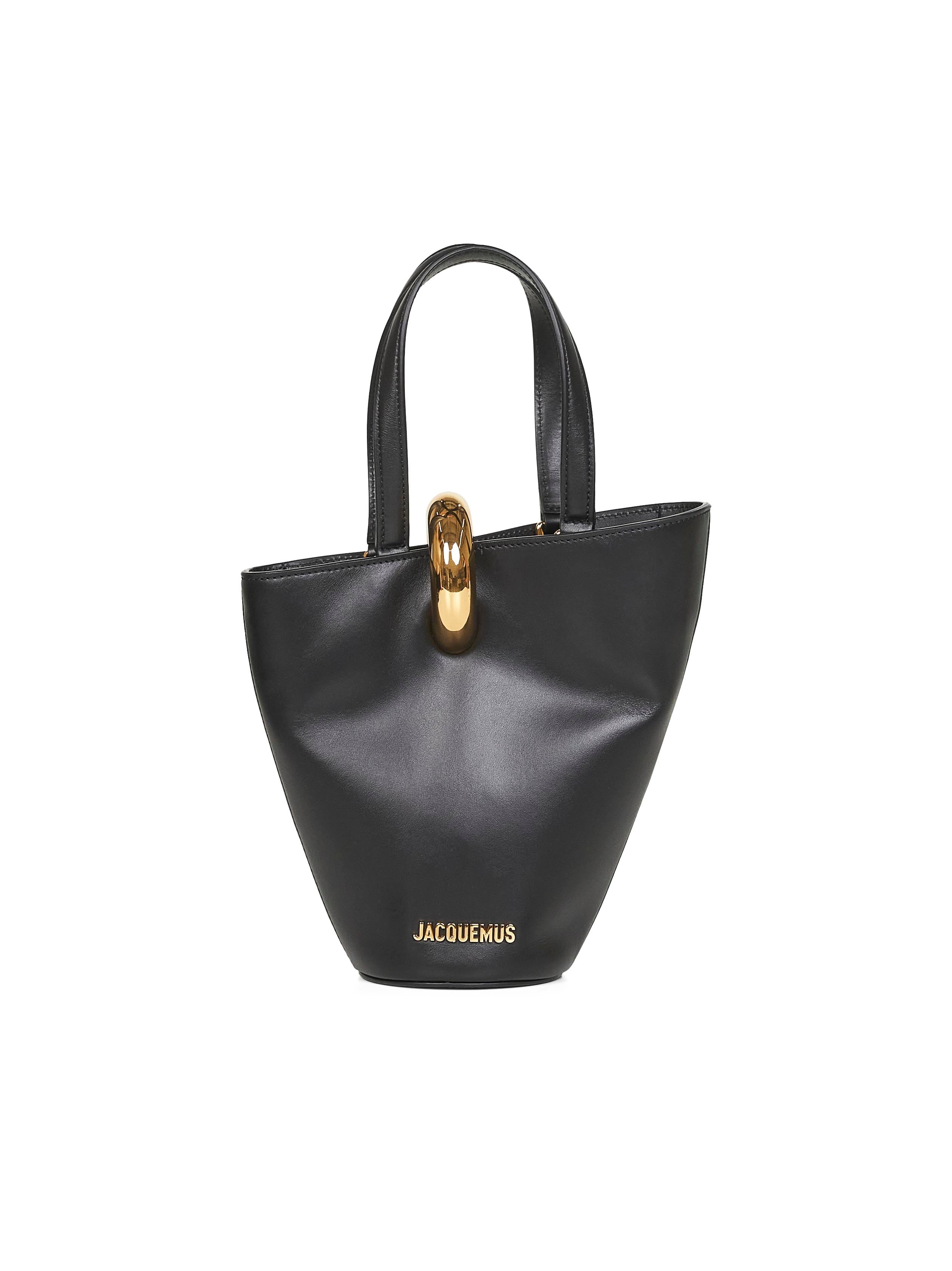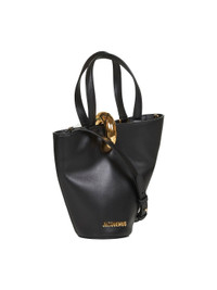 - Metal ring fastening; magnetic fastening - Double top leather handle; adjustable and detachable leather shoulder strap - Metal jacquemus logo at front - Interior: one main compartment, one zip pocket; cotton lining - Dyed edges; topstitched details - Gold-toned metal hardware - Smooth leather asymmetric mini bucket design - 24 x 24 x 10 cm; shoulder strap drop: 50 cm - Black color - 100% calf leather - Made in italy Natural (Veg): Cotton100 % Made in: ITALIA Season: A25 BAW00389AC01C01-990