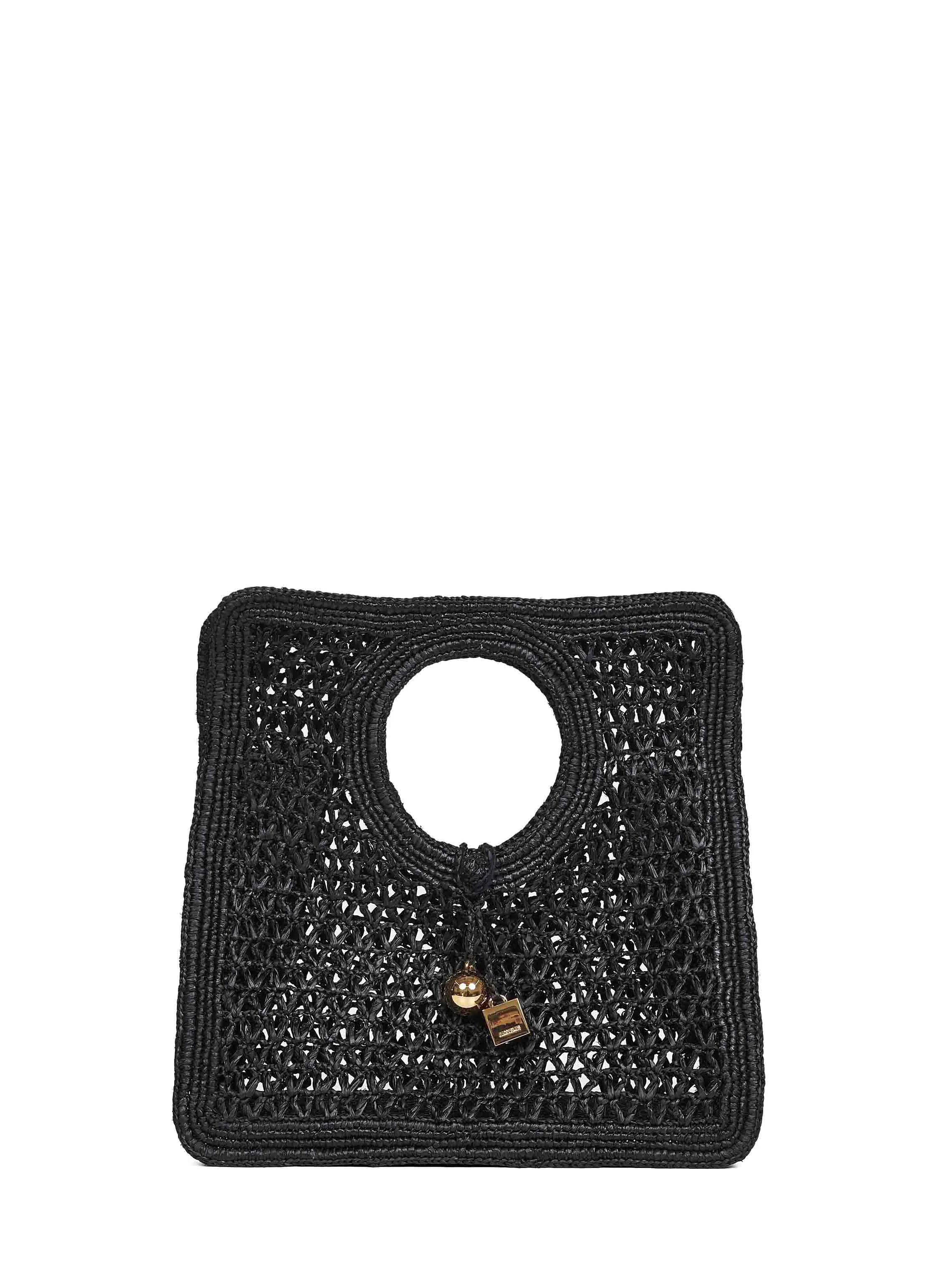 - Knot fastebing with metal rond-carre charms; jacquemus logo engraved at square charm - Double cut-out handle - Interior: one main gusseted compartment; unlined - Gold-toned metal hardware - Reinforced braided edges - Flat woven raffia design - 35 x 35 x 11 cm; handle diameter: 11.5 cm - Black color - 100% raffia - Made in extra eu Natural (Veg): Raffia100 % Made in: Madagascar Season: P26 BAW00421AW00513-990