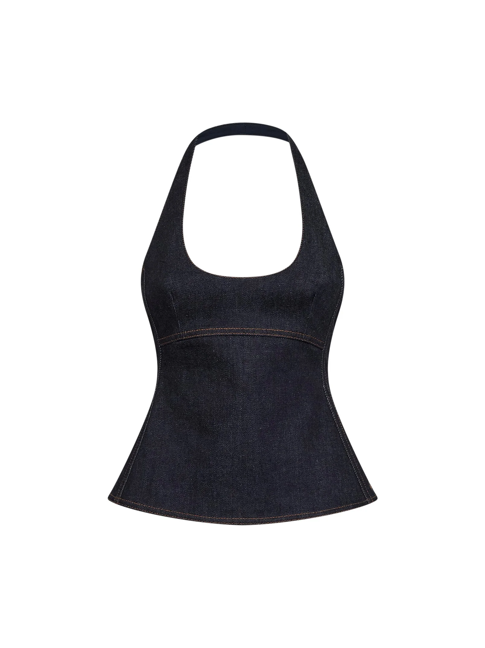 - Back covered zip closure - Halter neckline, deep rounded neckline - Sleeveless - Contrasting "j" embroidery at side - Godet inserts at sides - Yoke at bust - Flared bottom - Contrasting topstitching - Stretch indigo denim design - Fitted fit - Blue color - 96% cotton, 4% elastane - Made in france Natural (Veg): Cotton96 % Synthetic: Elastane4 % Made in: France Season: P26 TOW00890AD00041-390