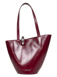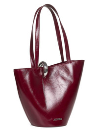 - Metal ring fastening; magnetic fastening - Double top leather handle - Metal jacquemus logo at front - Interior: one main compartment, one zip pocket; cotton lining - Dyed edges; topstitched details - Silver-toned metal hardware - Glossy vintage-finished leather asymmetric bucket design - 34.5 x 41 x 19 cm; handle drop: 35 cm - Burgundy color - 100% calf leather - Made in italy Furs & Skins: Calf Leather100 % Made in: ITALIA Season: A25 BAW00412AC20C01-490