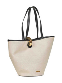 - Metal ring fastening; magnetic fastening - Long double top leather handle - Metal jacquemus logo at front - Interior: one main compartment, one zip pocket; cotton lining - Flat leather bottom - Dyed edges; topstitched details - Smooth black leather trims - Gold-toned metal hardware - Cotton and linen blend canvas asymmetric bucket design - 60 x 35 x 23 cm; handle drop: 34 cm - Greige color - 44% cotton, 44% linen, 12% acrylic - Made in italy Natural (Veg): Cotton44 % Natural (Veg): Linen/Flax44 % Synthetic: Acrylic12 % Made in: ITALIA Season: A25 BAW00382AW00094-1IQ
