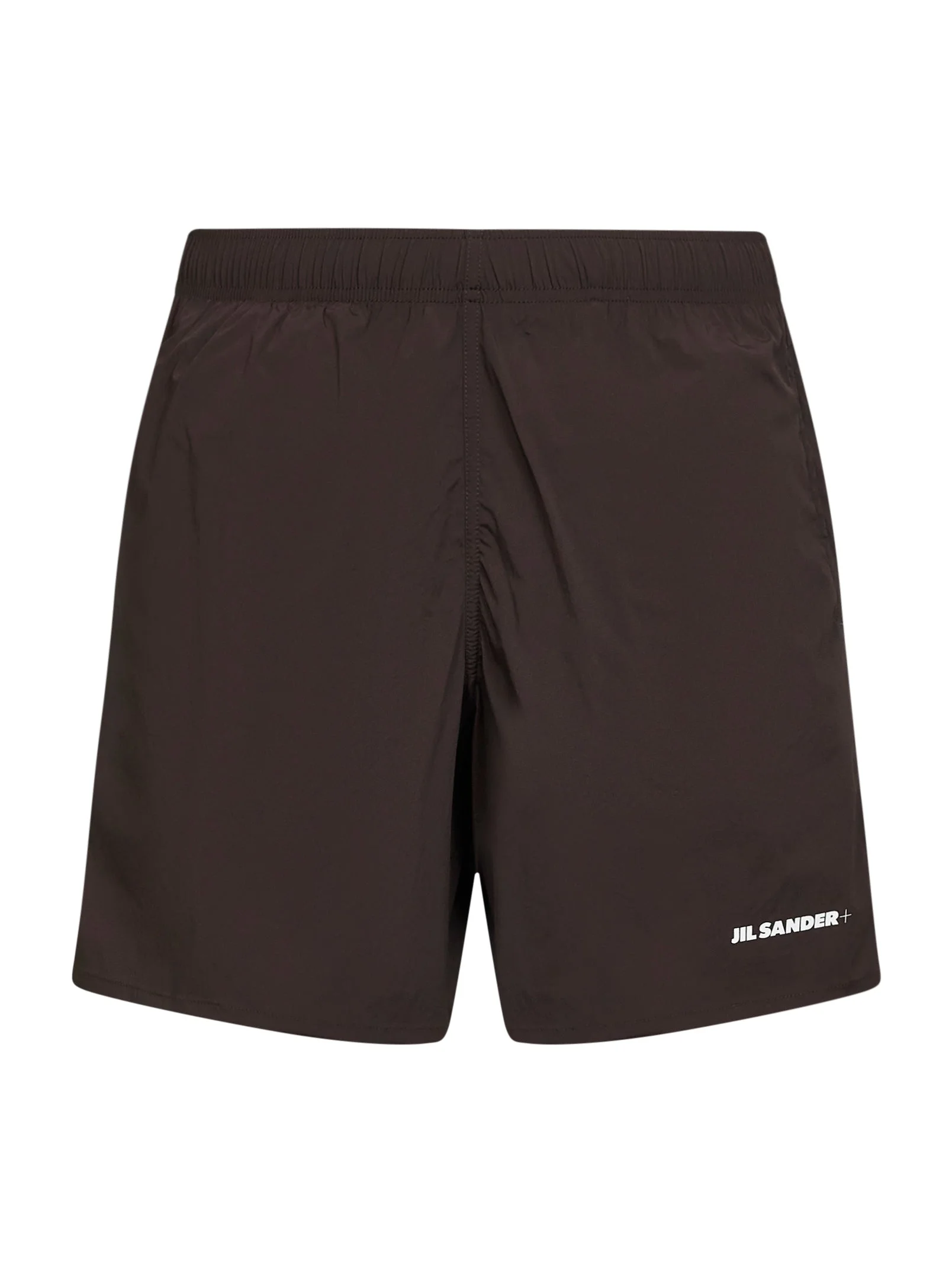 - Elasticated waistband with adjustable inner drawstring - Side pockets, back welt pocket with covered zip closure - Contrasting jil sander+ logo printed at left leg - Lined - Regular fit - Brown color - 92% polyamide, 8% elastane - Made in italy Made in: ITALIA Season: P26 J47SP0108J20006202