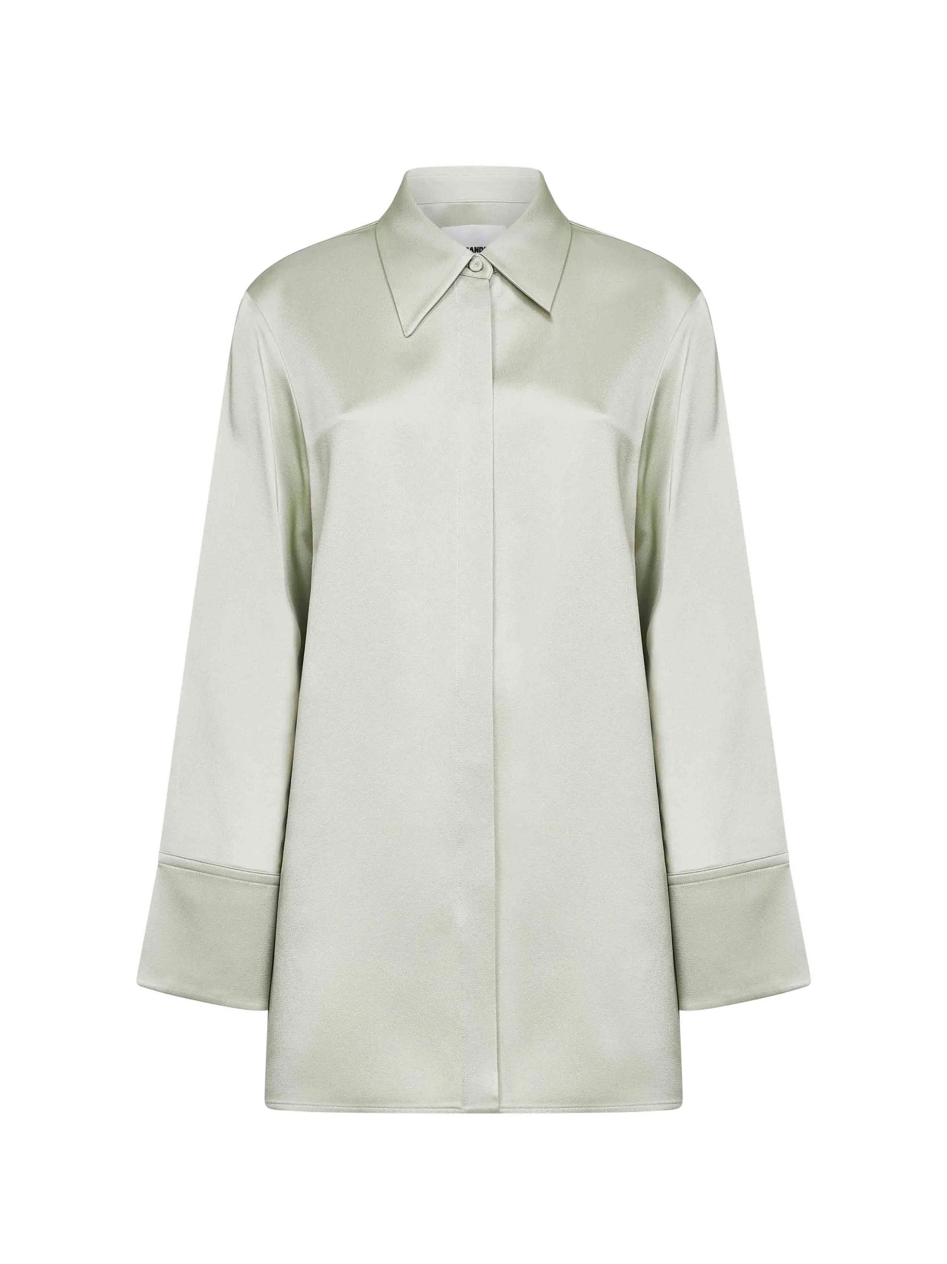 - Front covered button placket - Pointed collar - Long sleeves, soft shoulders, buttoned cuffs - Back yoke - Shaped side slits at bottom; side seams binding detail - Straight hem - Relaxed fit - Pastel green color - 74% acetate, 26% viscose - Made in italy Synthetic: Acetate74 % Synthetic: viscose26 % Made in: ITALIA Season: P26 J02DL0284J76018338