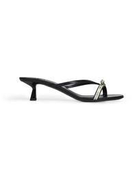 - Slip-on - Rounded toe - Thin leather straps; thin strap with jimmy choo ribbon and bow detail at front - Lacquered heel - Leather lining and insole - Leather sole - Heel height: 45mm - Black color - 100% calf leather - Made in italy Furs & Skins: Calf Leather92 % Synthetic: Plastic5 % Metals & Alloys: metal3 % Made in: ITALIA Season: A25 CIELAMULE45GZGBLACKBUTTERMILKBLACK