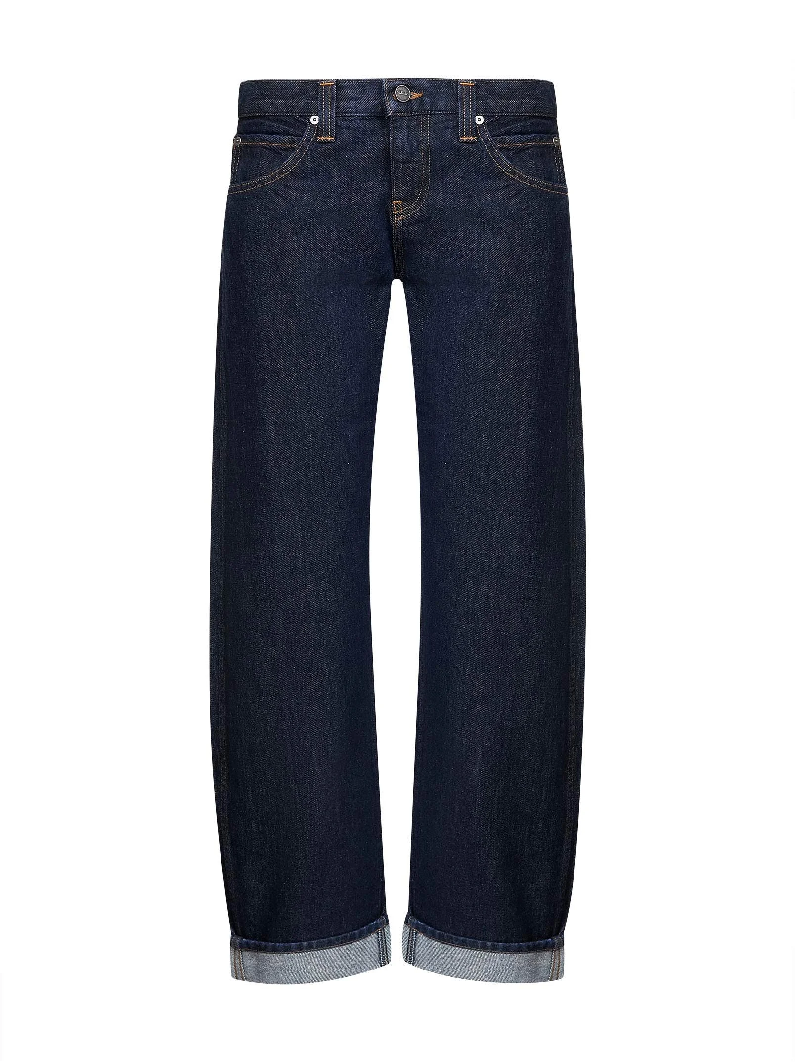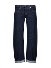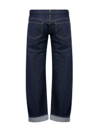 - Front zip-fly closure, embossed antique nickel button - Low-rise waist with belt loops - Five pocket model - Turn-up hems - Curved leg seams - Bowed leg - Benson-wash indigo rigid denim design; hand-finished - Regular fit - Blue color - 100% cotton - Made in extra eu Natural (Veg): Cotton100 % Made in: Stati Uniti Season: P26 1180908040-040