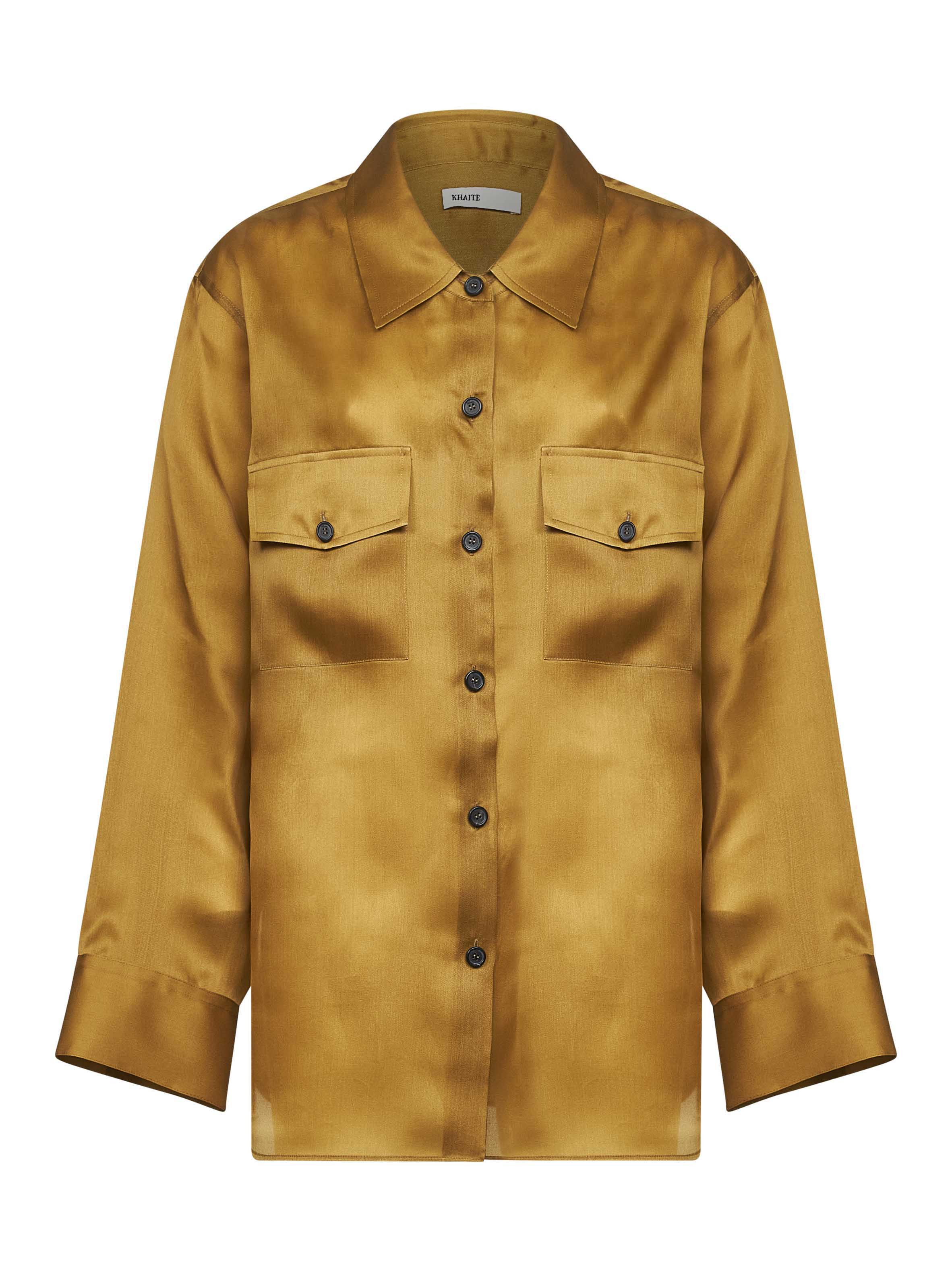 - Front button placket - Pointed collar - Long extended sleeves, dropped shoulder seams, buttoned cuffs - Patch pockets at chest with buttoned flap - Straight back yoke - Notched shirttail hem - Horn buttons - Elongated and relaxed cut - Regular fit - Ocher color - 100% silk - Made in extra eu Natural (other): Silk100 % Made in: Stati Uniti Season: A25 24043002-604