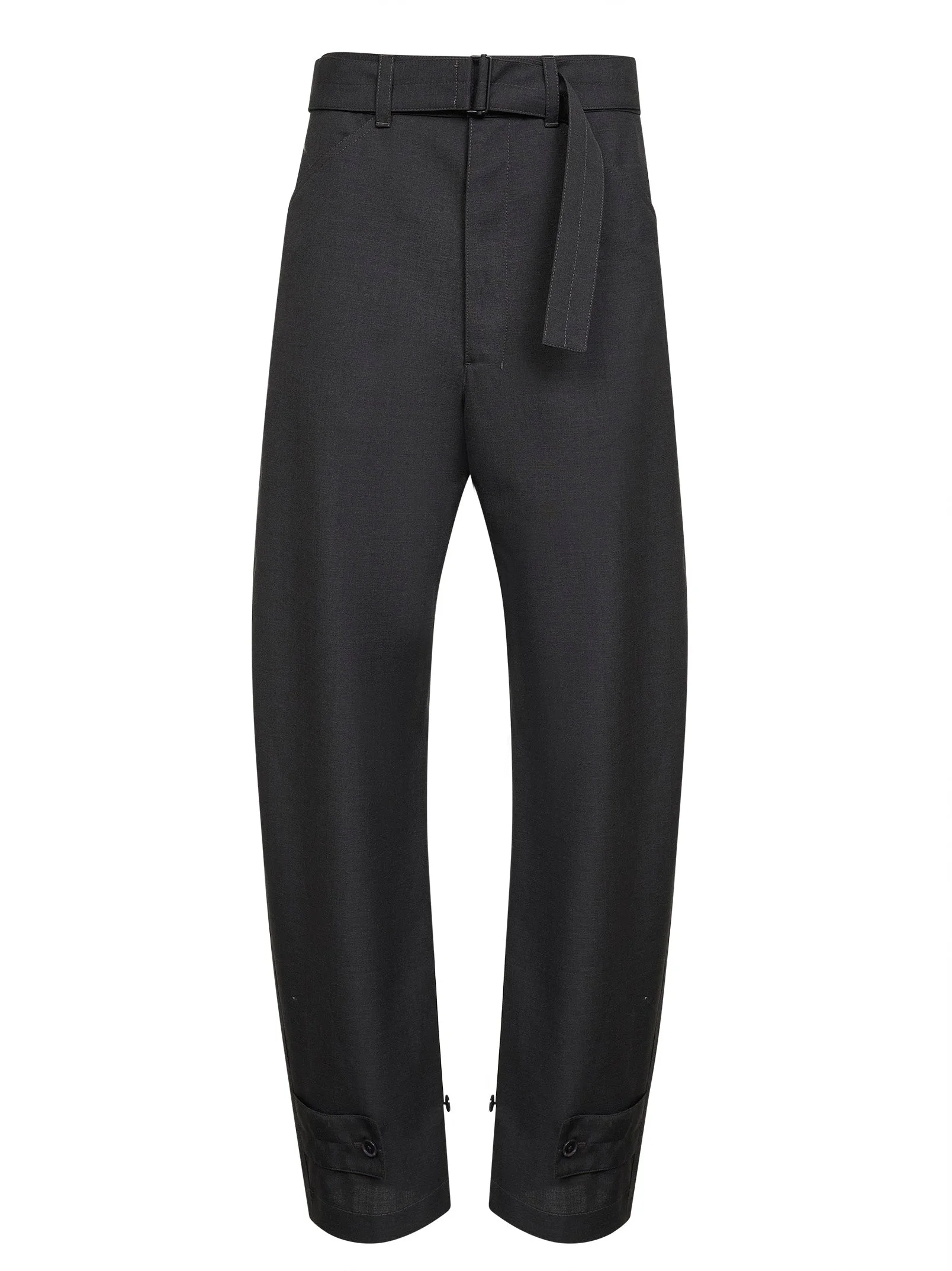 - Front covered closure - Waist with belt loops; adjustable and detachable matching belt at the waist with metal buckle - Side italian pockets, back welt pockets, one buttoned - Adjustable legs bottom with buttoned tab - Curved leg - Straight cut - Grey color - 55% polyester, 45% wool - Made in portugal Natural (Veg): Cotton100 % Made in: Portogallo Season: A25 PA1223LF414BK996