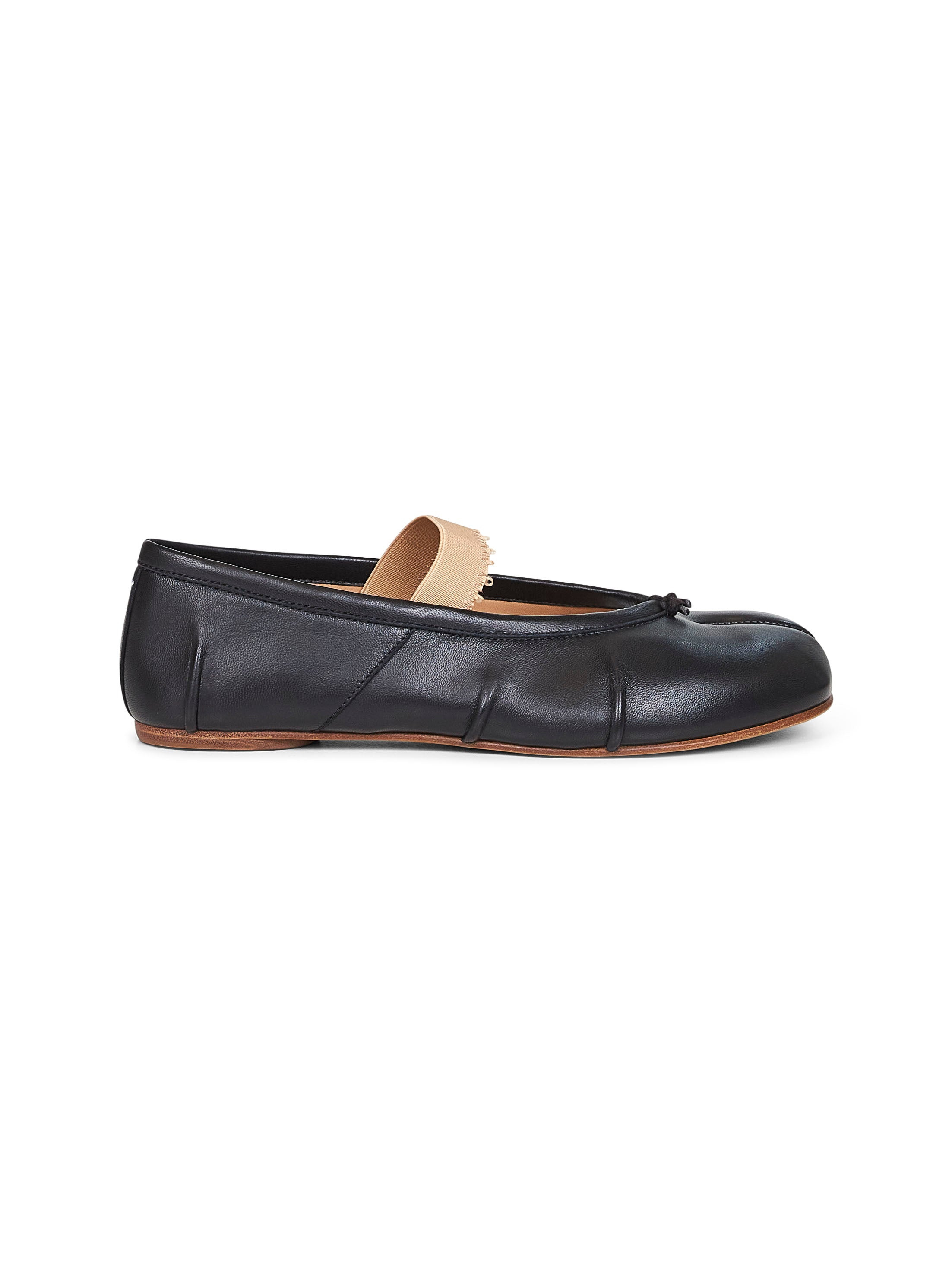 - Slip-on; distressed-effect elastic band at instep - Tabi split-toe - Cotton knot at front - White stitching at back - Nappa leather upper with handmade leather pleats - Leather lining and insole - Leather sole with rubber insert; maison margiela logo at sole - Black color - 100% lambskin - Made in italy Furs & Skins: Calf Leather100 % Made in: Italy Season: A25 S39WZ0104P6853HA334