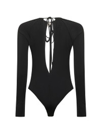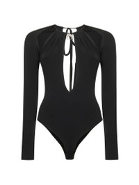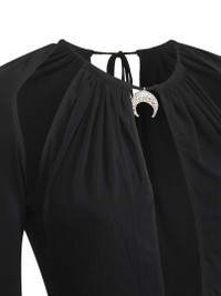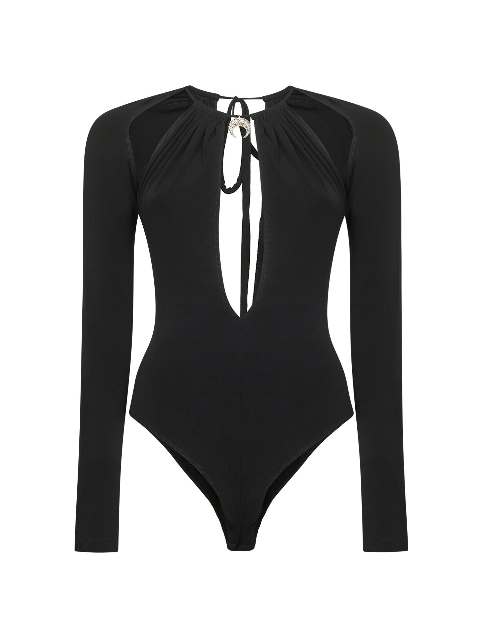 - Snap button closure at crotch - Self-ties at neck back; long keyhole cut-out - Draped crewneck with crystal-embellished moon charm at front; plunging neckline at front - Long raglan sleeves, cut-out details at shoulders - Fitted fit - Black color - 95% viscose, 5% elastane - Made in france Synthetic: viscose95 % Synthetic: Elastane5 % Made in: France Season: A25 WTO459ACJER0082BK99