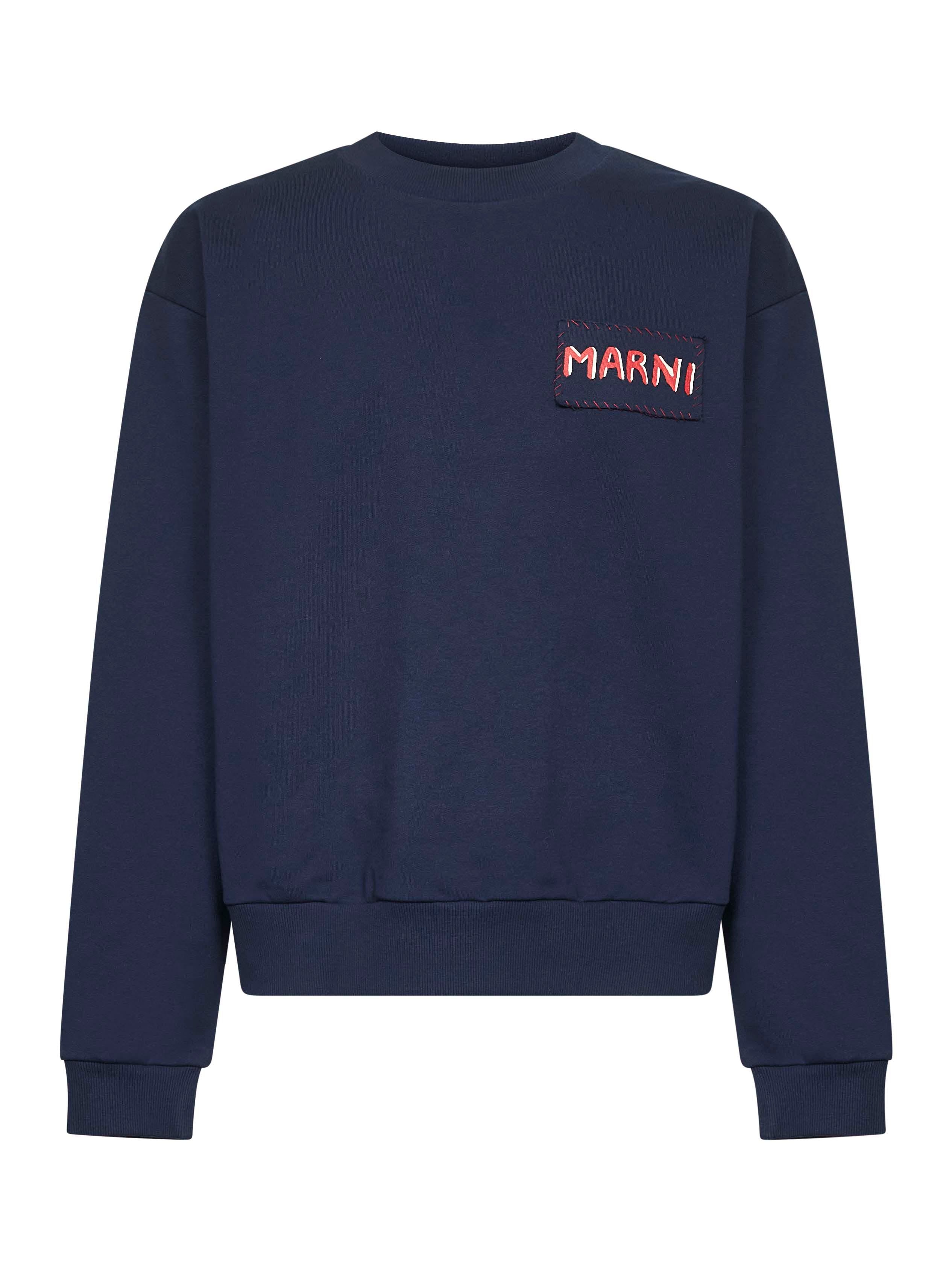 - Ribbed crewneck - Long sleeves, dropped shoulders - Embroidered label at chest with contrasting marni logo and topstitching - Ribbed cuffs and bottom band - Regular fit - Blue color - 100% cotton - Made in italy Natural (Veg): Cotton100 % Made in: ITALIA Season: A25 FUMU0074X1UTC27500B95
