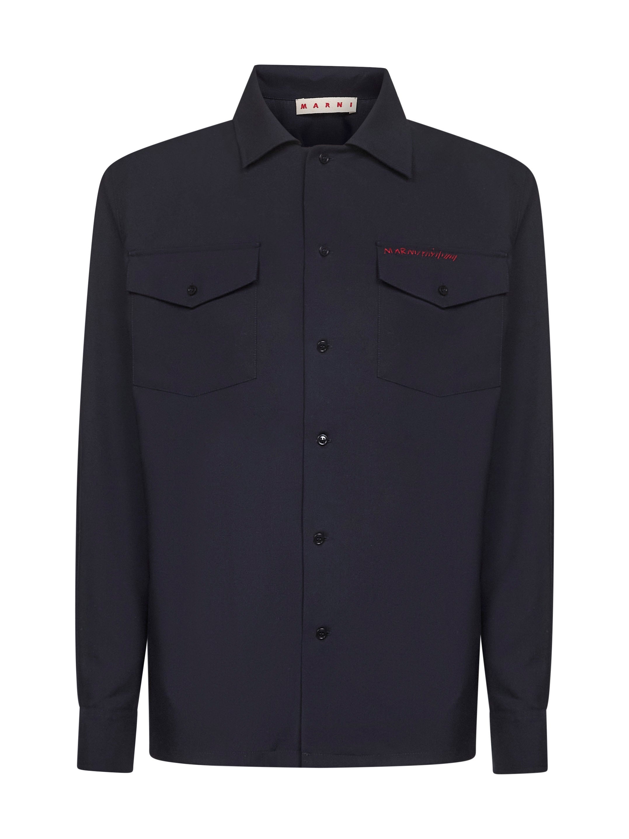 - Front button placket - Pointed collar - Long sleeves, buttoned cuffs - Patch chest pocket with contrasting hand-made marni mending embroidery - Straight hem - Relaxed fit - Blue color - 100% virgin wool - Made in romania Wool or fine animal hair: Virgin Wool100 % Made in: Romania Season: A25 CUMU0310S0TW83900B99