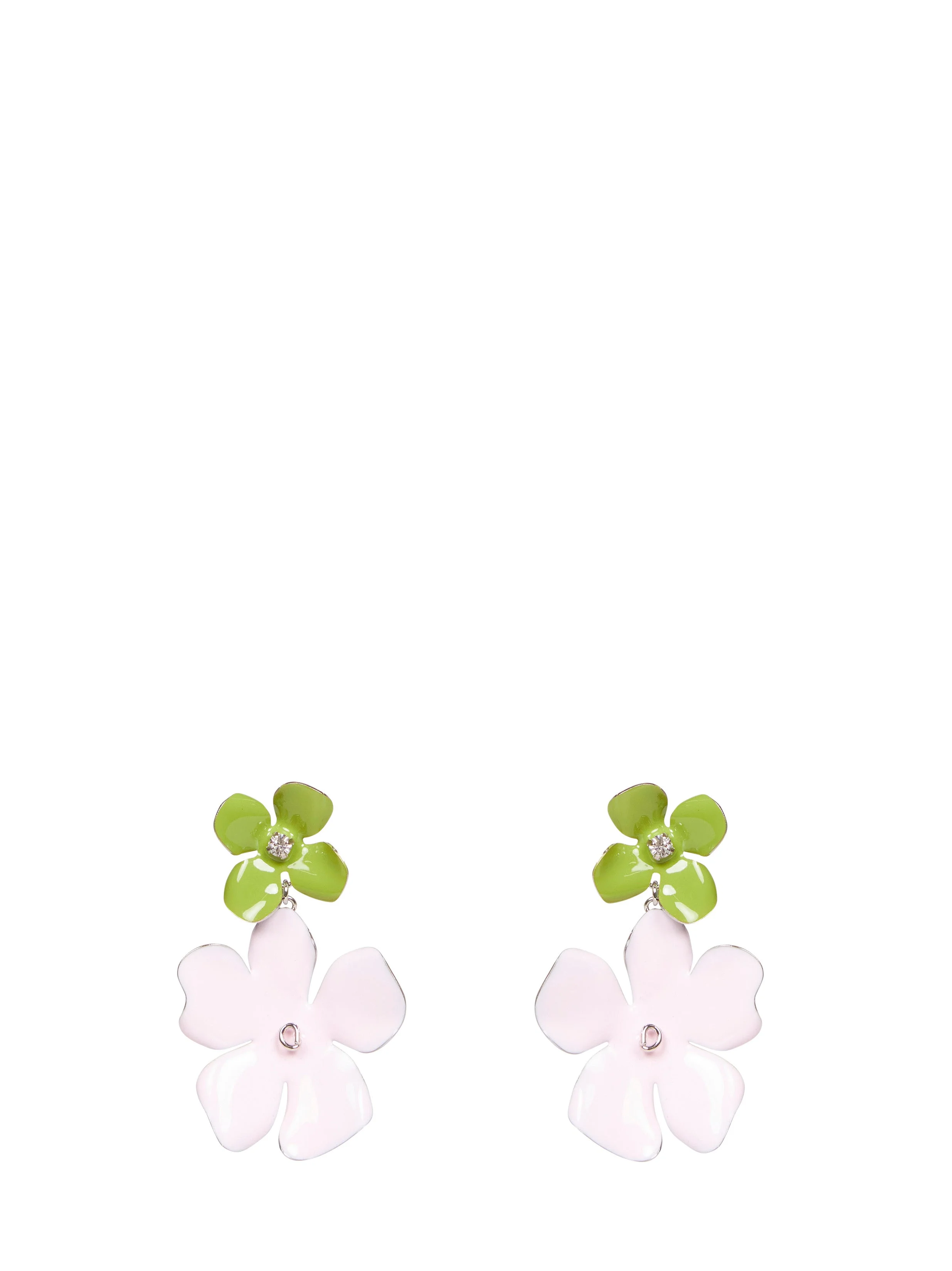 - Back fastening; for pierced ears - Drop design with asymmetric two-tone plated hand-painted and enameled brass flowers; central rhinestones at top flower - Color: light pink/green - 100% brass - Made in italy Metals & Alloys: Brass100 % Made in: ITALIA Season: P26 ORMV0635A0P652700C47