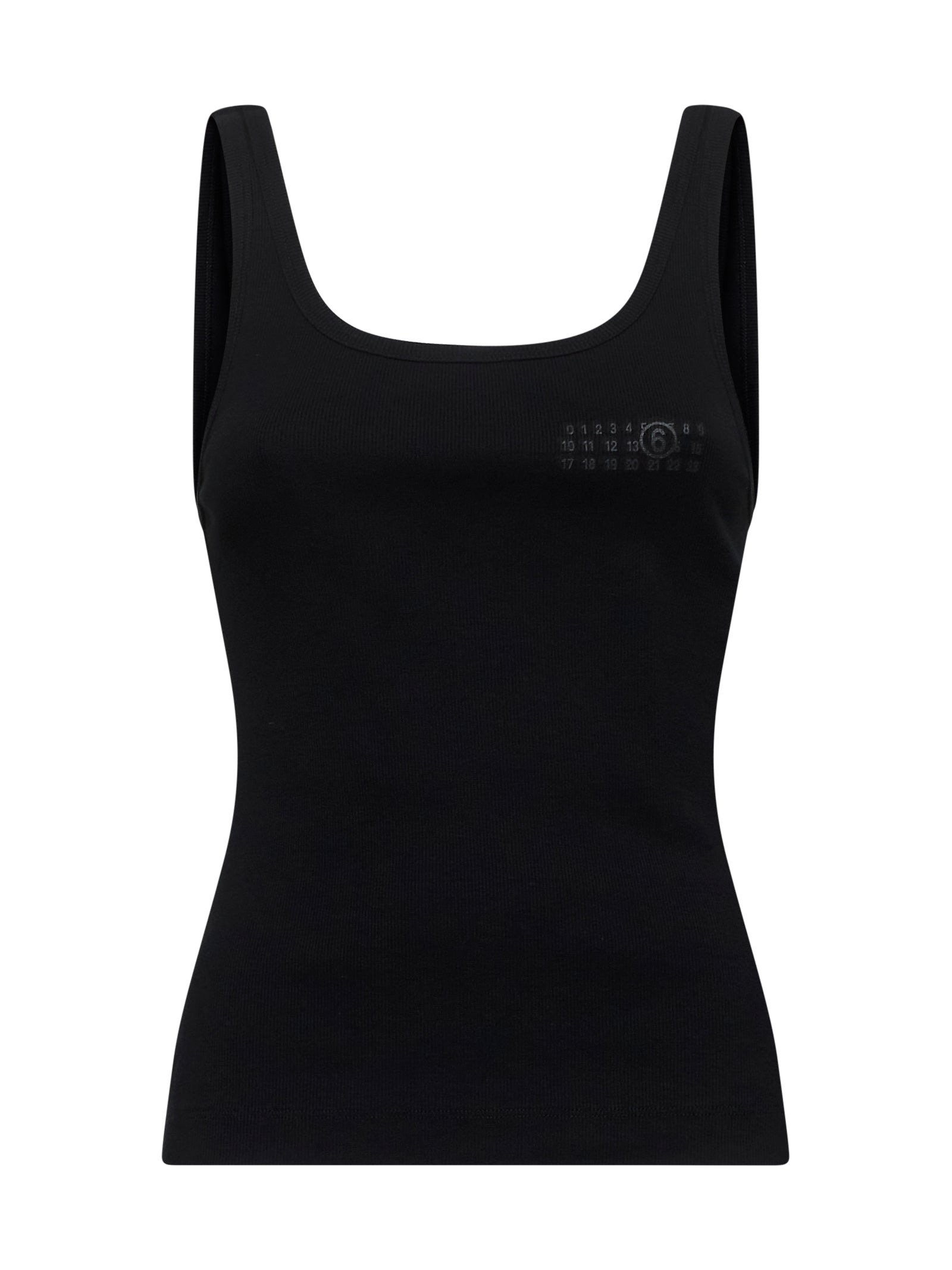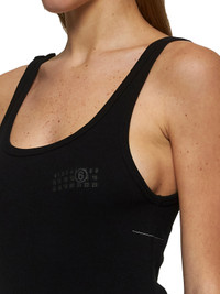 •Round neckline at front and back •Sleeveless, detachable shoulder strap with hook fastening •Tone-on-tone MM6 numeric signature ; White stitch line •The garment can also be worn 90 degrees rotated with the detachable shoulder strap that changes position and modifies the neckline •Fitted fit •Black color •98% Cotton, 2% Elastane •Made in Italy Size and fit: Model is 173 cm tall and wears size S Country of manifacture: Italy ID designer: S52NL0070M20054900
