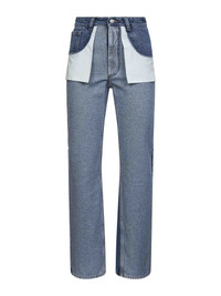 - Covered front closure, metal logo button - High waist with belt loops - Five-pocket model - White stitch line at back; mm6 numeric signature label at back pocket - Inside out-effect at front with exposed lining at pockets - Straight leg - Blue color - 100% cotton - Made in italy Natural (Veg): Cotton100 % Made in: Italy Season: A25 S52LA0256M30018967