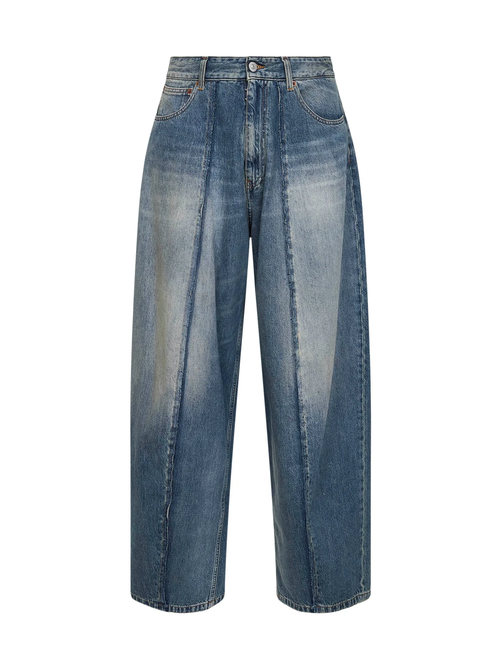- Front zip-fly closure, metal logo button - Waist with belt loops - Five-pocket model - Logo patch at back waistband; white stitch line at back - Contrasting topstitching - Panelled construction with seams detailing at front; faded denim design - Wide leg - Oversized fit - Blue color - 100% cotton - Made in italy Natural (Veg): Cotton100 % Made in: ITALIA Season: P26 SH0LA0011M30055961