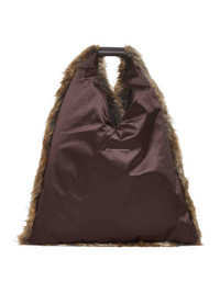 - Magnetic button fastening on leather detail - Top handle with leather detail with embossed numeric logo - Interior: one main compartment; cotton lining - White stitch line at back - Eco fur design with plain satin back - 50 x 55 x 2 cm - Brown color - 80% acrylic, 20% polyester - Made in extra eu Synthetic: Acrylic80 % Synthetic: Polyester20 % Made in: China Season: A25 S54WD0039P8486H9076