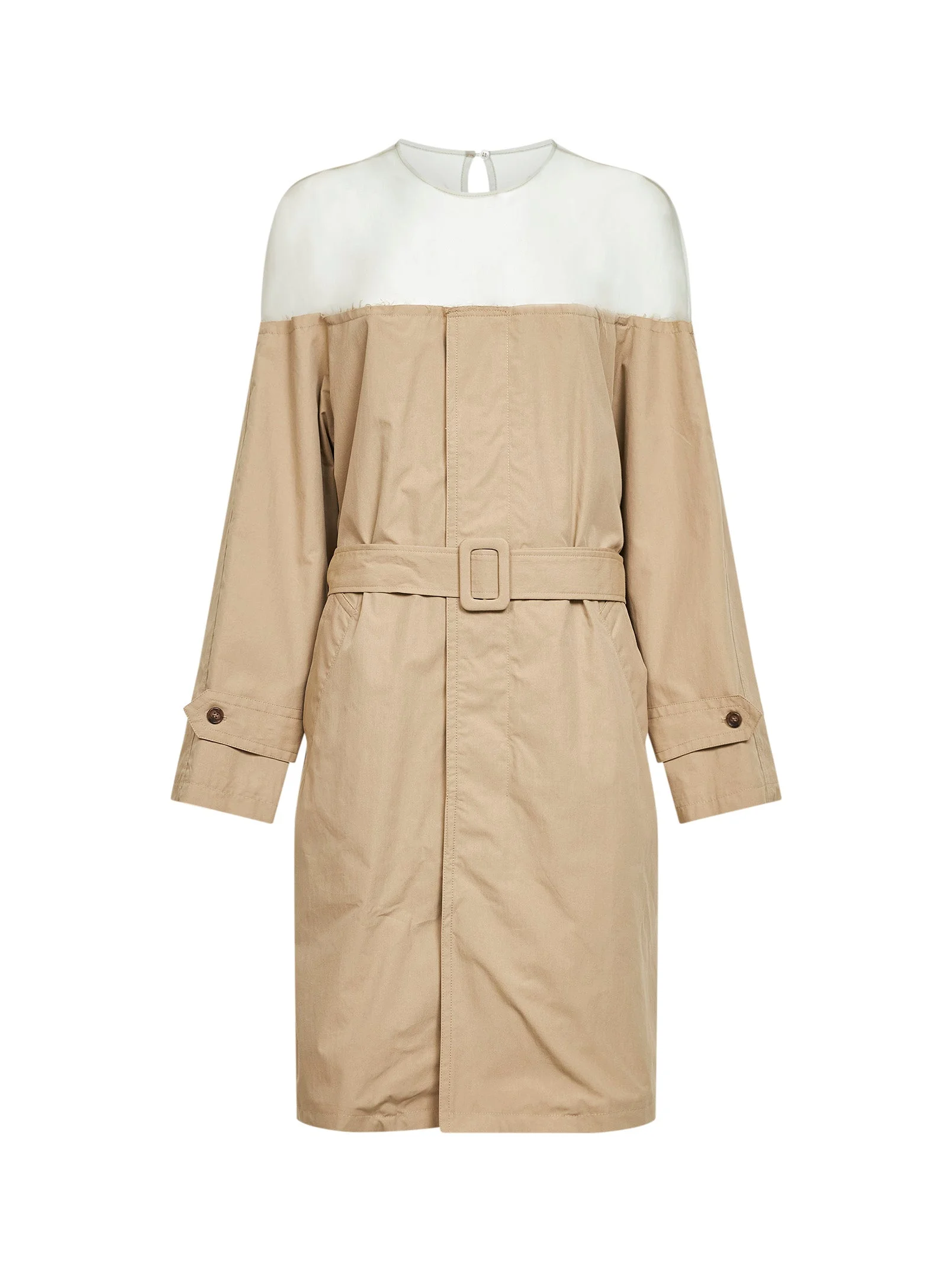 - Button closure at neck back, keyhole cut-out; decorative flap at front - Crewneck - Long sleeves, buttoned tab at cuffs - Adjustable and detachable matching belt at the waist - Sheer fabric yoke - Slanted side welt pockets - White stitch line at back - Central slit at back - Midi length - Pinky beige color - 66% cotton, 34% polyamide - Made in italy Natural (other): Silk100 % Made in: Season: P26 S62DD0062M35858115