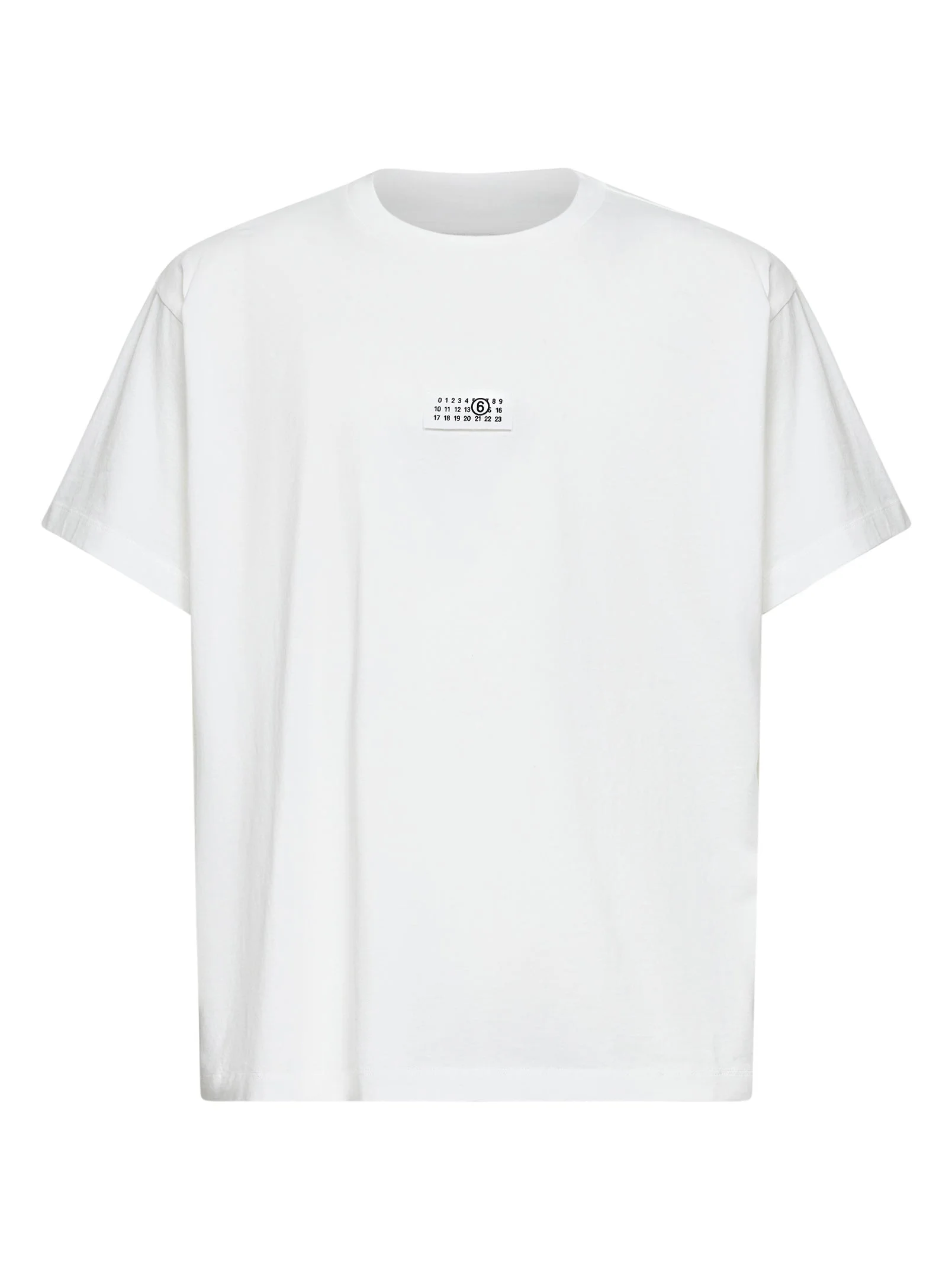 - Ribbed crewneck - Short sleeves, dropped shoulders - Contrasting mm6 numeric graphic label embroidered at chest - White stitch line at back - Straight hem - Regular fit - White color - 100% cotton - Made in italy Natural (Veg): Cotton100 % Made in: ITALIA Season: P26 SH0GC0032M20170101