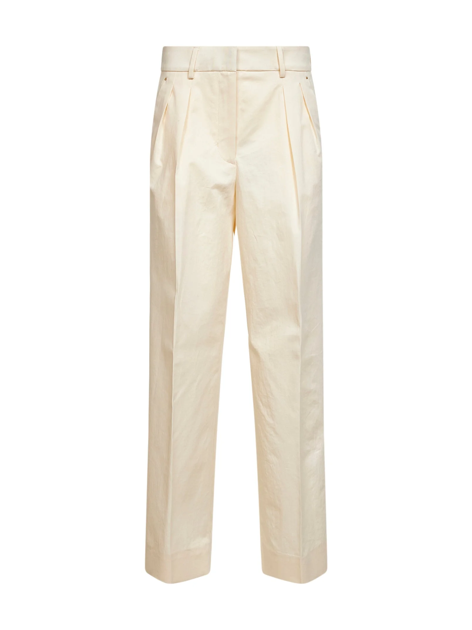 - Front zip-fly and hook closure - Waist with belt loops - Side slant pockets, back welt pockets; gold-toned metal logo-shaped studs detail at side pockets - Tone-on-tone leather logo patch at back - Double front pleat - Pressed legs creases - Wide leg - Natural color - 100% cotton - Made in bulgaria Natural (Veg): Cotton100 % Made in: Bulgaria Season: P26 L10932A00004599CG051