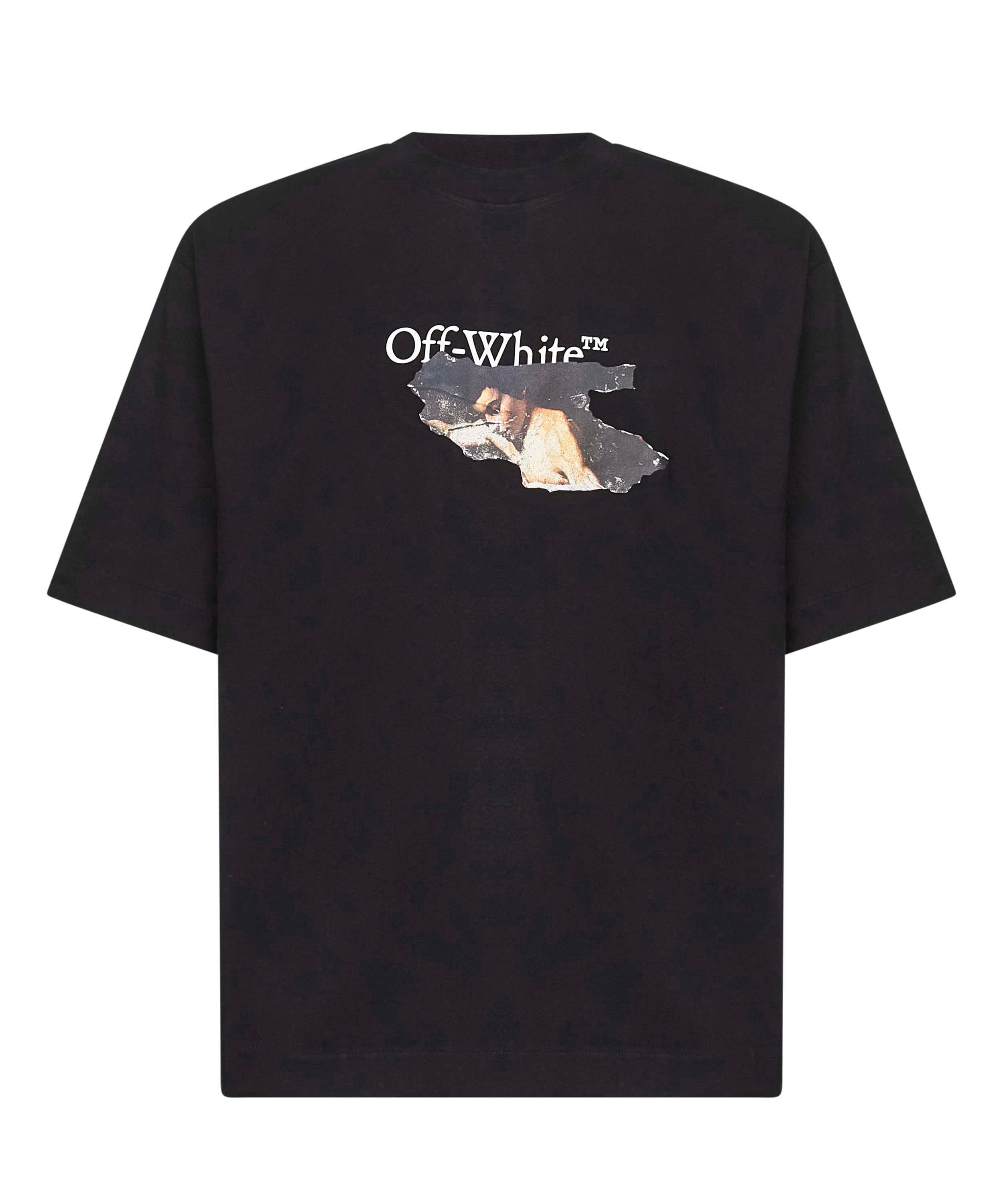 - Ribbed crewneck - Short sleeves - Paint print with white off-white logo at front - Paint arrow print at back - Skate fit - Black color - 100% cotton - Made in portugal Natural (Veg): Cotton100 % Made in: Portogallo Season: A25 OMAA120F25JER00U-1001